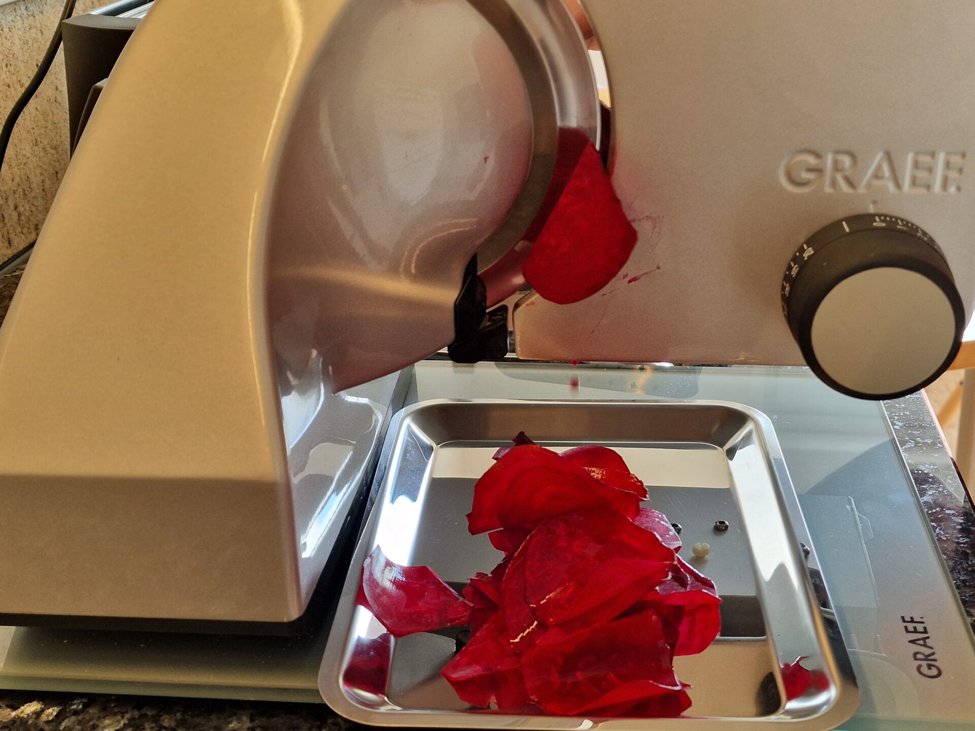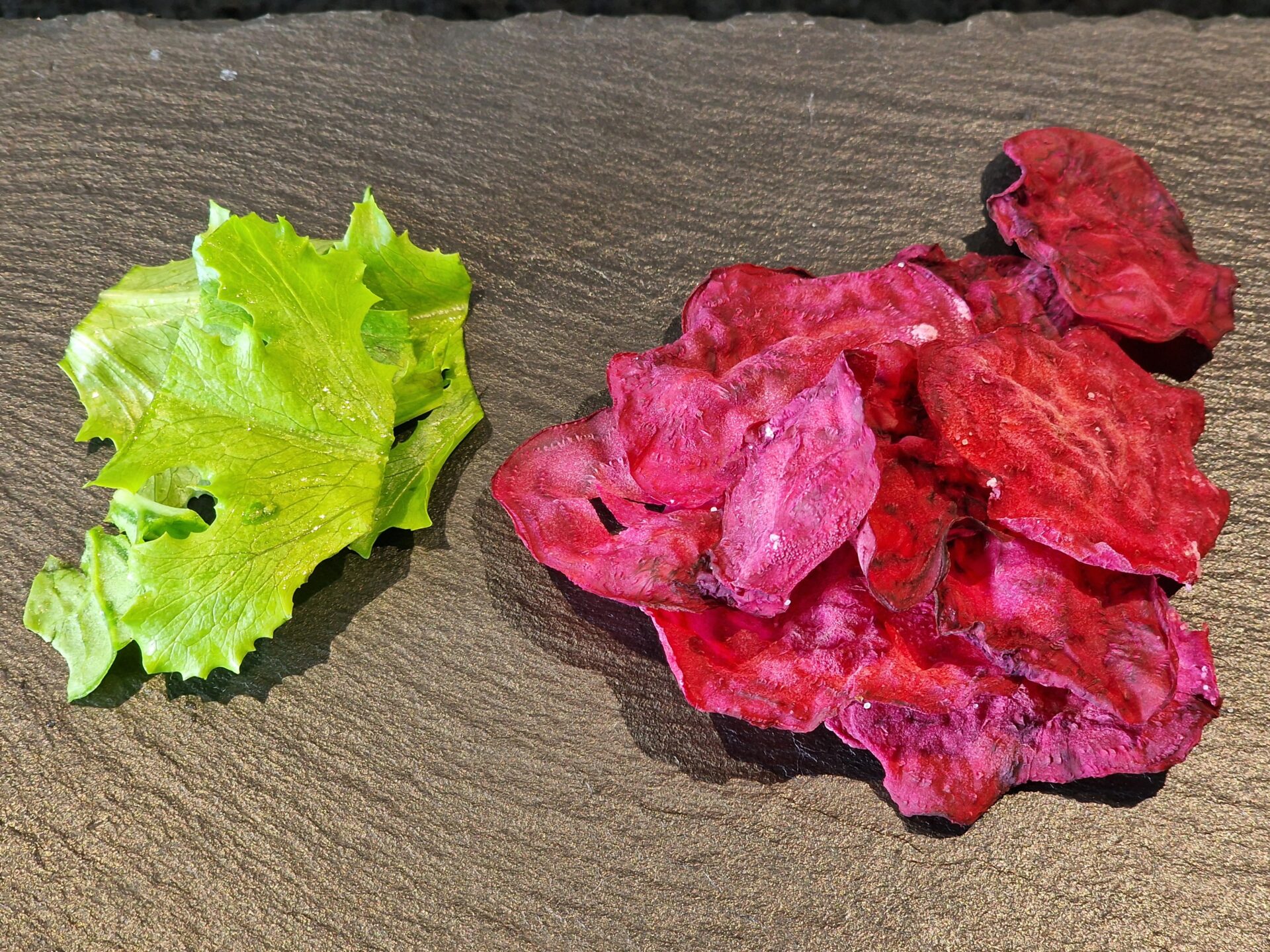 Tipp: Als Dreierlei von der Roten Bete mit Labskaus und Rote Bete Minicrepe zu Matjes servieren. Diese Chips sind nicht mit Öl besprüht, also komplett ohne Fett hergestellt. Das heißt, das sie bei höherer Luftfeuchte auch wieder Wasser ziehen können und dann die krosse Konsistenz verlieren. Werden sie enmal kurz im Ofen erneut getrocknet, kommt die gewünschte Konsistenz zurück.