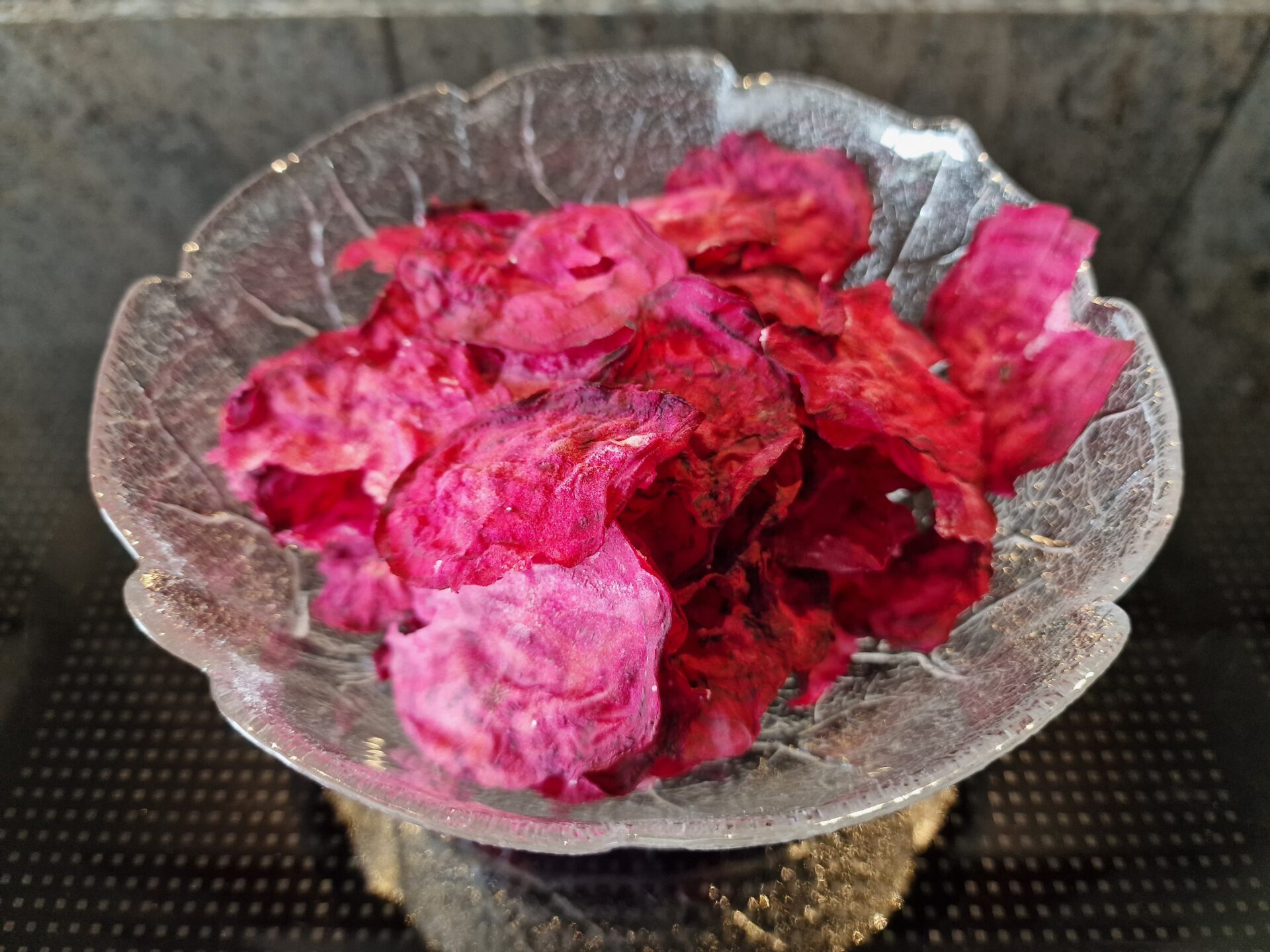 Rote Bete schälen und mit der Küchenmaschine in dünne Scheiben schneiden. Backbleche mit Backtrennpaper auslegen. Rote Bete Scheiben einzeln darauf verteilen, leicht mit etwas Salz bestreuen. Bei 90°C (Umluft) für 90 Minuten crisp trocknen lassen. Immer wieder überprüfen, damit die Chips nicht dunkel werden. Nach etwa 30 Minuten wenden.