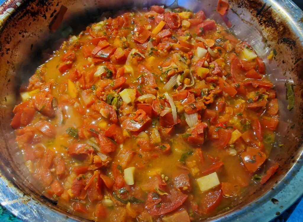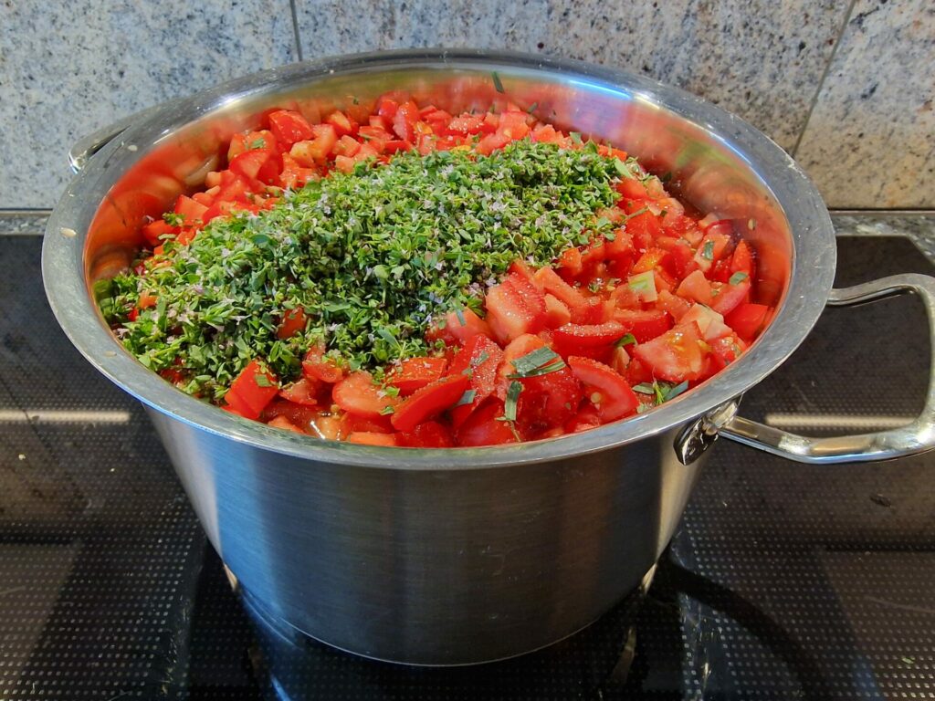 Zwiebeln in Olivenöl in einem großen Topf anbraten, Kräuter, Chili und Knoblauch zugeben. Sellerie und Möhren zufügen, dann Tomaten und Salz dazugeben und alles etwas umrühren. Im Backofen bei 180°C (Heißluft) für drei Stunden abgedeckt garen lassen. Nach der Garzeit die Sauce pürieren und noch etwas ohne Deckel einköcheln lassen, damit sie sämig wird, etwas kühle lassen. In Beutel portioniert abfüllen, abkühlen lassen und einfrieren.