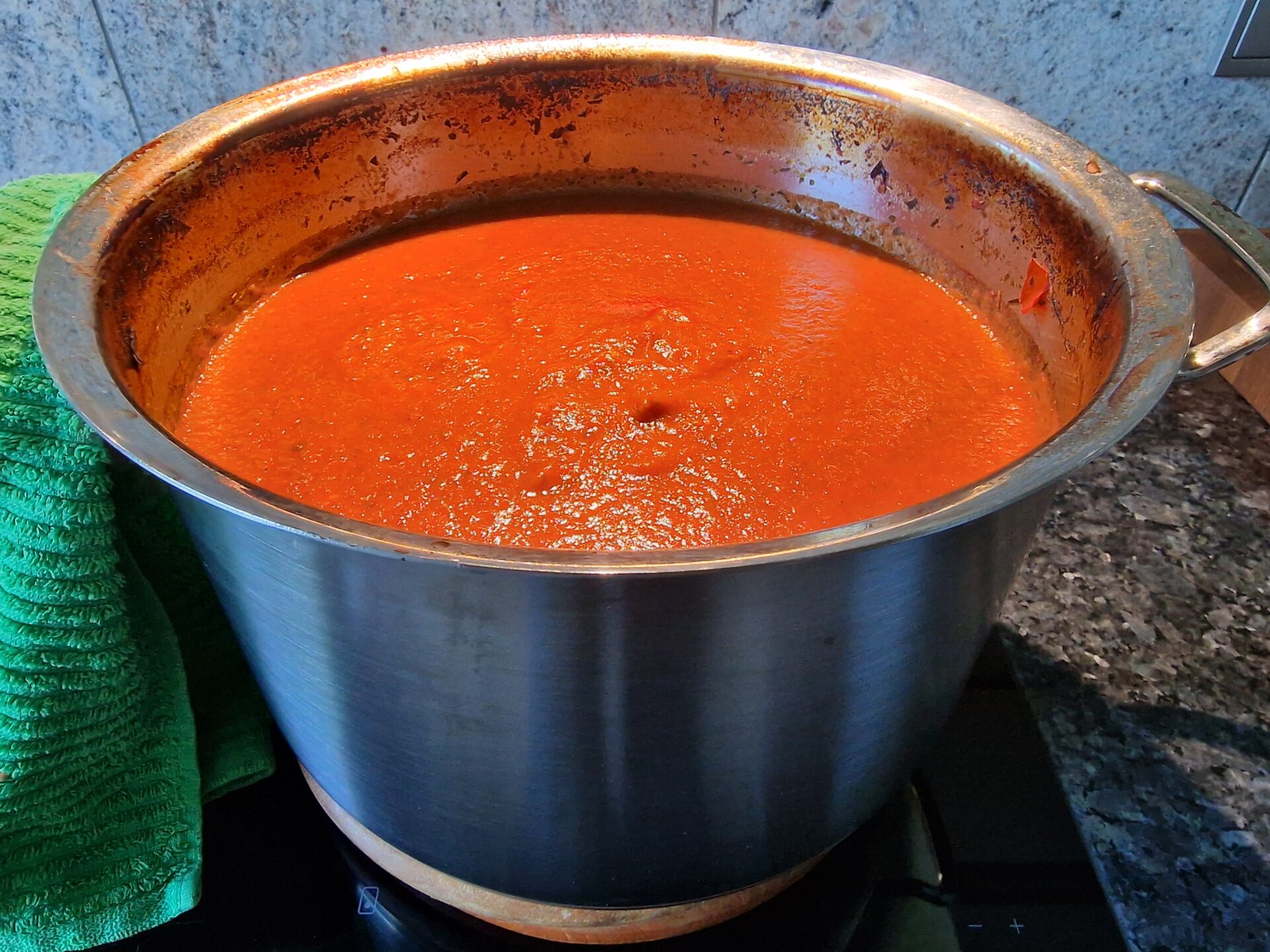 Zu viele Tomaten im Garten? Dann können wir für den Winter vorsorgen um immer rasch eine besondere Tomatensauce für kleine und große Gäste für ein Pasta- oder Pizzagericht oder auch zu Bohnen zur Hand zu haben. Die Chili im Rezept wirken viel, aber bei der längeren Kochzeit verliert sich viel Schärfe inder Menge der Zutaten. Für kleine Gäste ist trotzdem eine Variante ohne Chili gut.