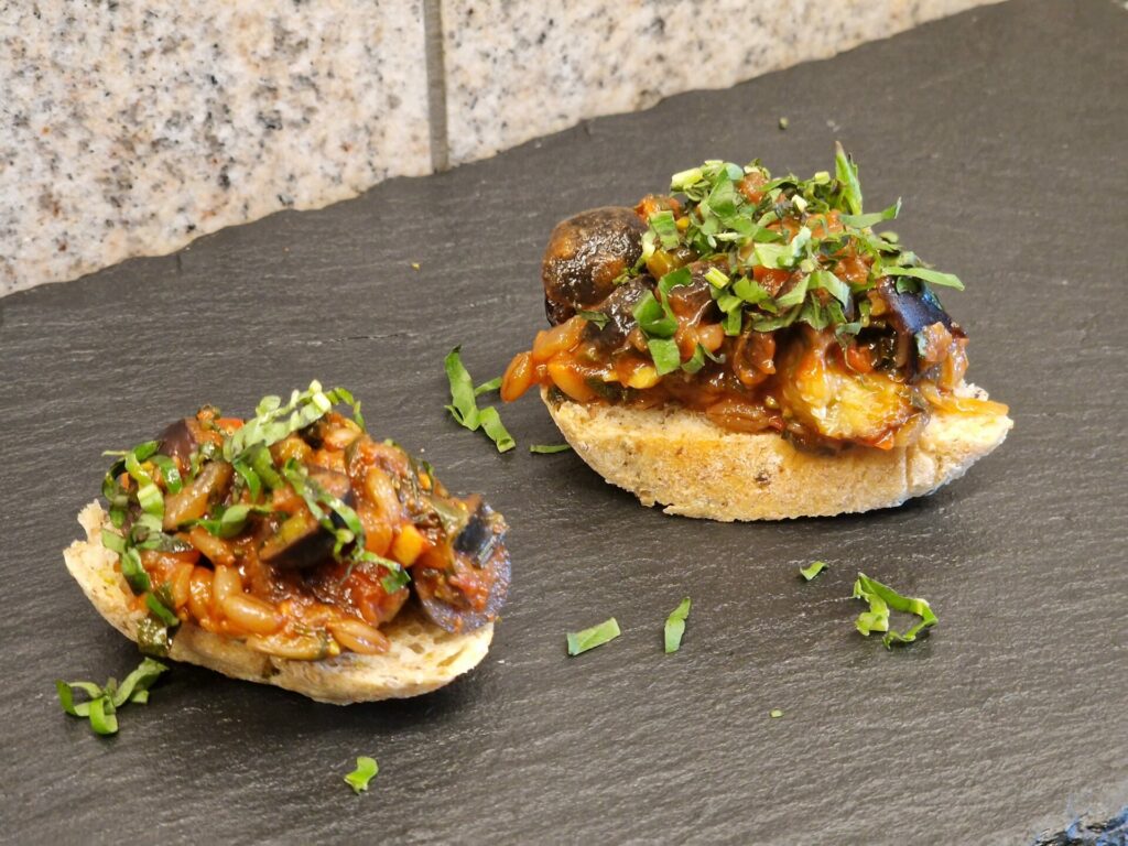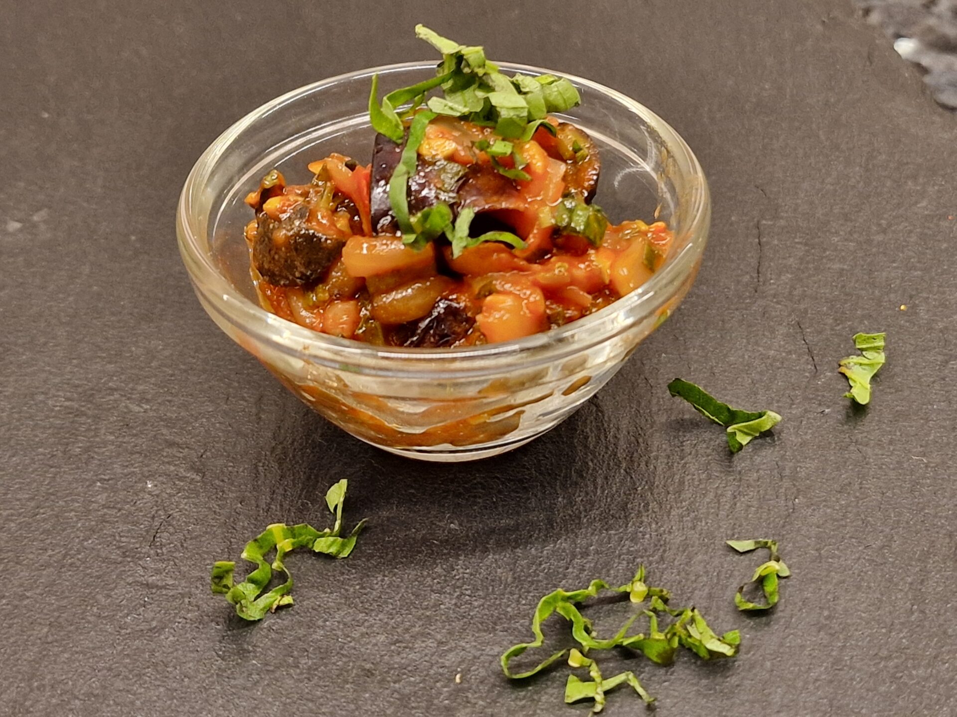 Diese Vorspeise stammt aus Sizilien und nennt sich Caponata, typisch mit Auberginen, Tomaten und Basilikum.