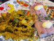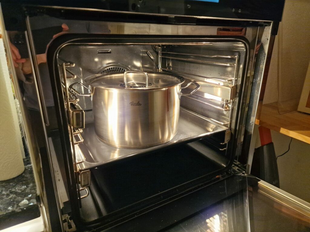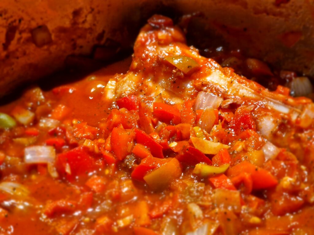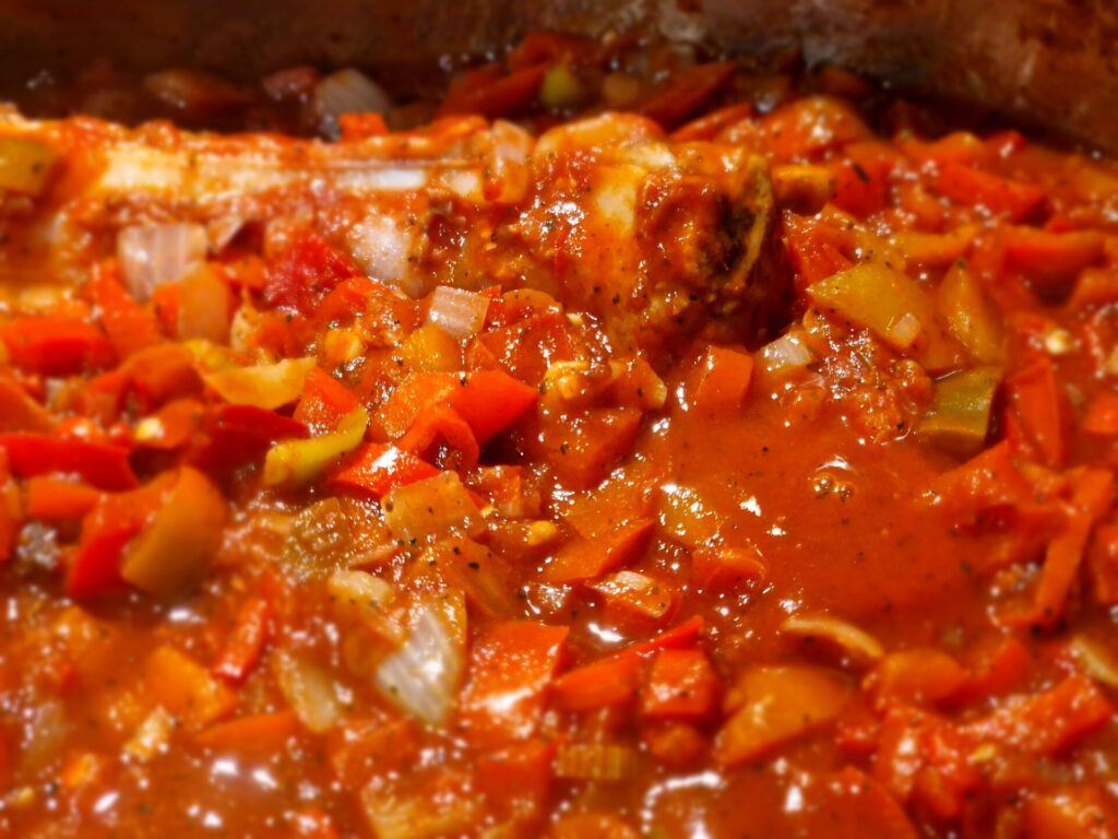 Nun die Rippchen und die angebratene Paprika samt Flüssigkeit und etwas Rotwein zugeben. Im Backofen bei 180°C abgedeckt etwa 1,5 – 2 Stunden langsam garen lassen. Anschließend die Knochen der Rippchen entnehmen und das Fleisch mundgerecht schneiden.