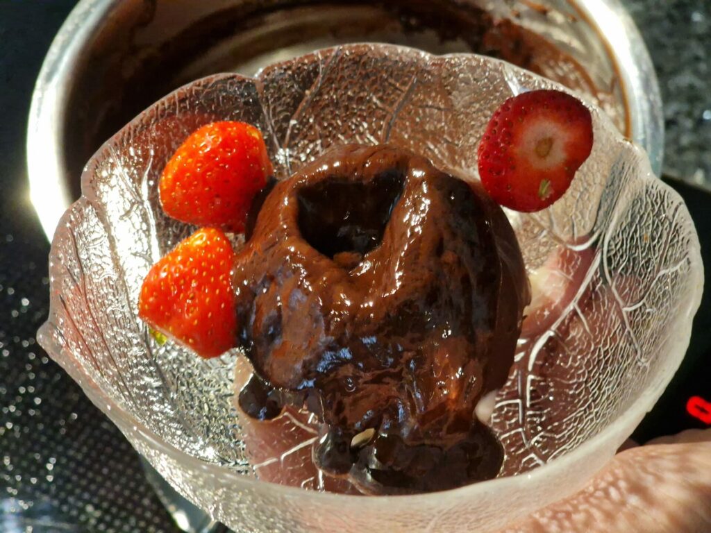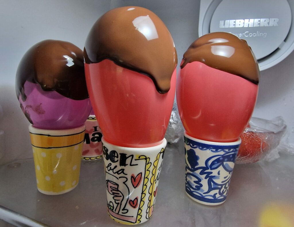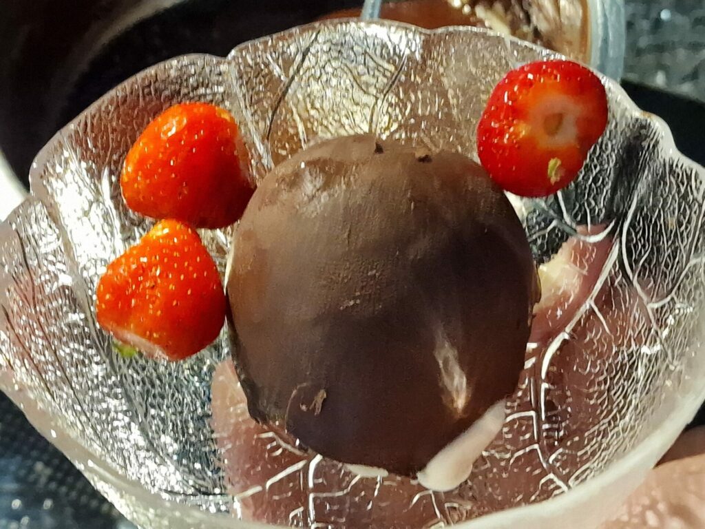 Diese Zusammenstellung haben wir in Estland kennen gelernt. Die Eiskugel wird mit der umgekehrten Schokoladenschale abgedeckt und mit heißer Schokoladensauce übergossen – die Schale schmilzt und die Eisüberraschung kommt zum Vorschein.