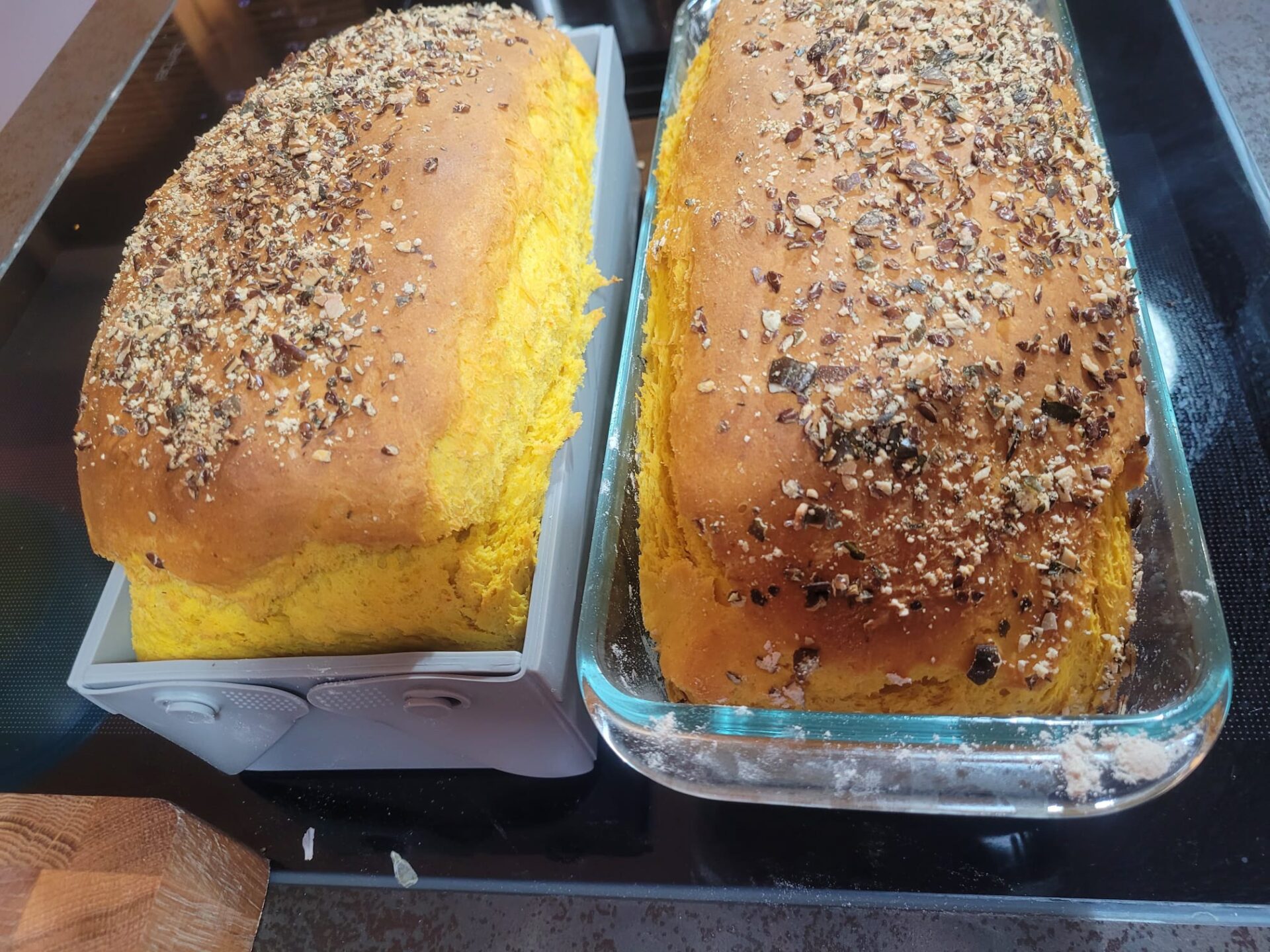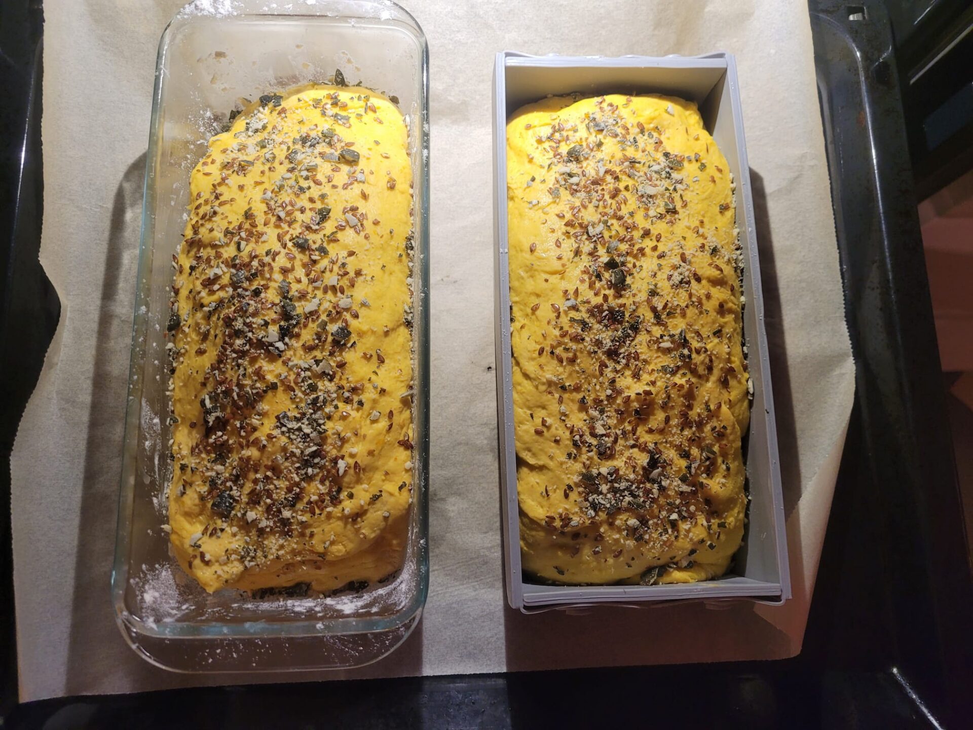 Den Teig nach der Ruhephase noch einmal kurz durchkneten, diesen dann auf der leicht bemehlten Arbeitsfläche zu einer Rolle formen. Die Rolle in die Kastenform geben und leicht mit Wasser bepinseln, den Kerne-Mix darüber streuen. Für diezweite Ruhephase den Teig nochmals an einem warmen Ort gehen lassen bis er deutlich aufgegangen ist.