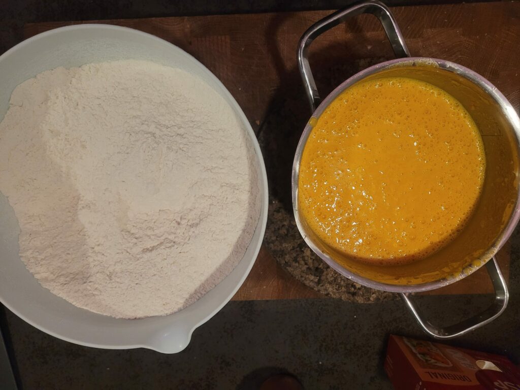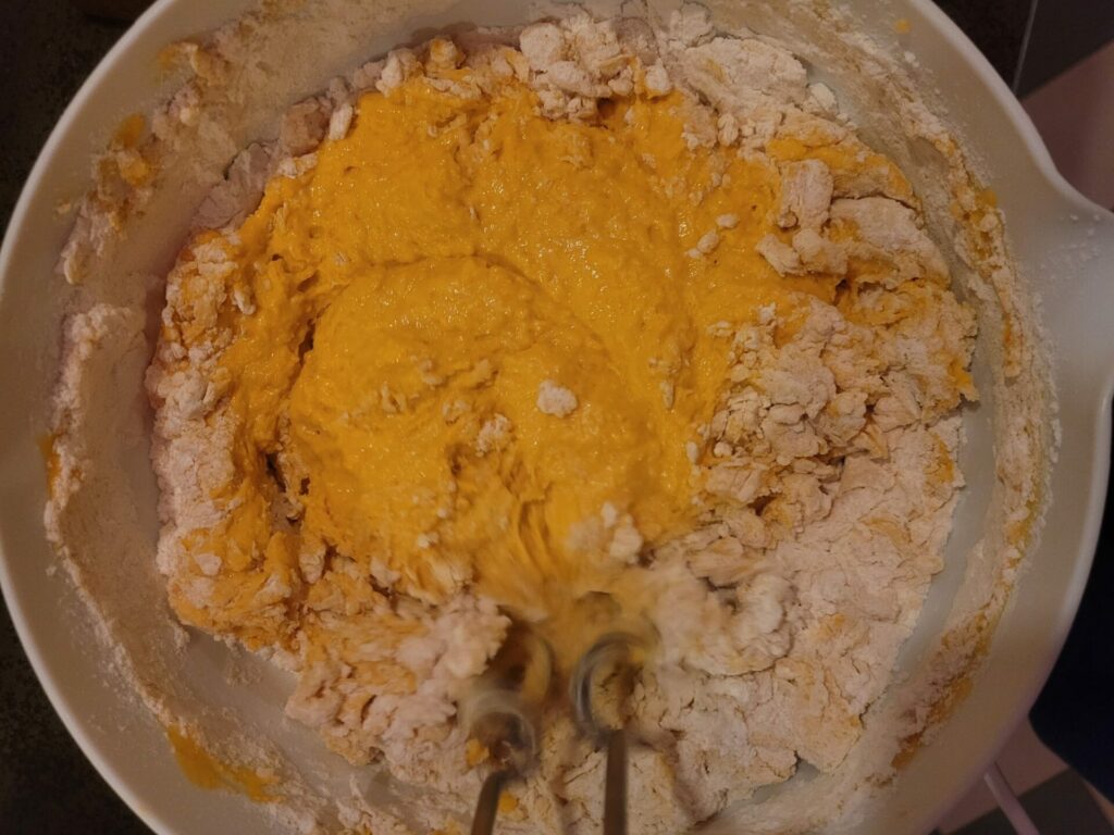 Zur Vorbereitung der Kürbis Mischung den gewaschenenen Kürbis in Spalten schneiden und die Kerne entfernen. 250 g grob klein geschnittene Kürbisstücke mit ein wenig Wasser etwa 15 Minuten garen, dann das überschüssige Wasser abgießen. Nun kann der Kürbis püriert werden. Milch erwärmen, Butter darin zerlassen , zugeben und verrühren.