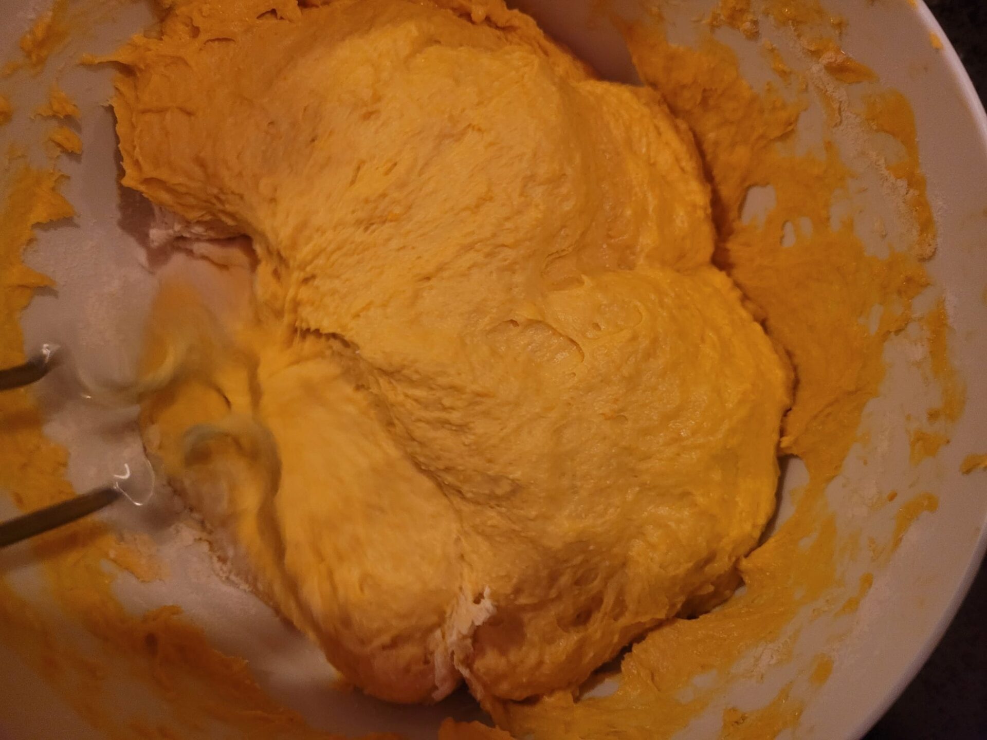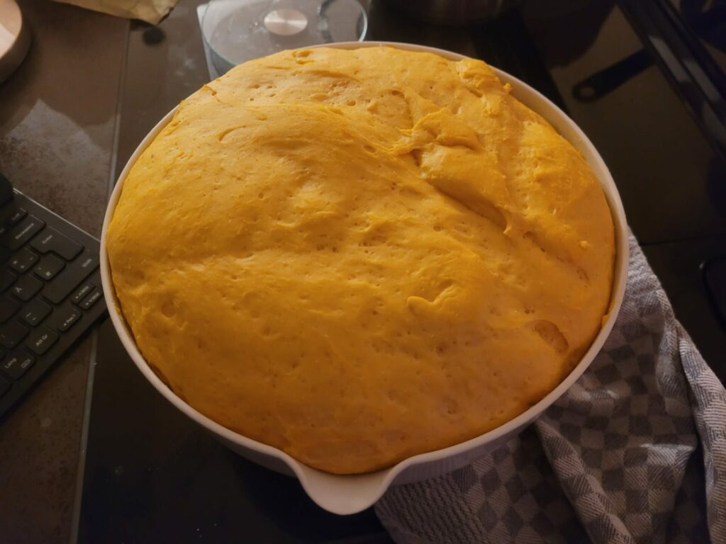 Für den Hefeteig das Mehl mit der Hefe vermischen. Die Kürbismischung und alle anderen Zutaten hinzufügen. Alles in der Rührmaschine (Knethaken) bei erst niedriger, dann höherer Drehzahl etwa 5 Minuten zu einem glatten Teig verarbeiten. Die Teigmasse zugedeckt an einem warmen Ort gehen lassen, bis sie sich in etwa verdoppelt hat. In der Zwischenzeit die Kastenform für den Stuten fetten und ein wenig bemehlen, um ein Ankleben des Teigs nach dem Backvorgang zu vermeiden.