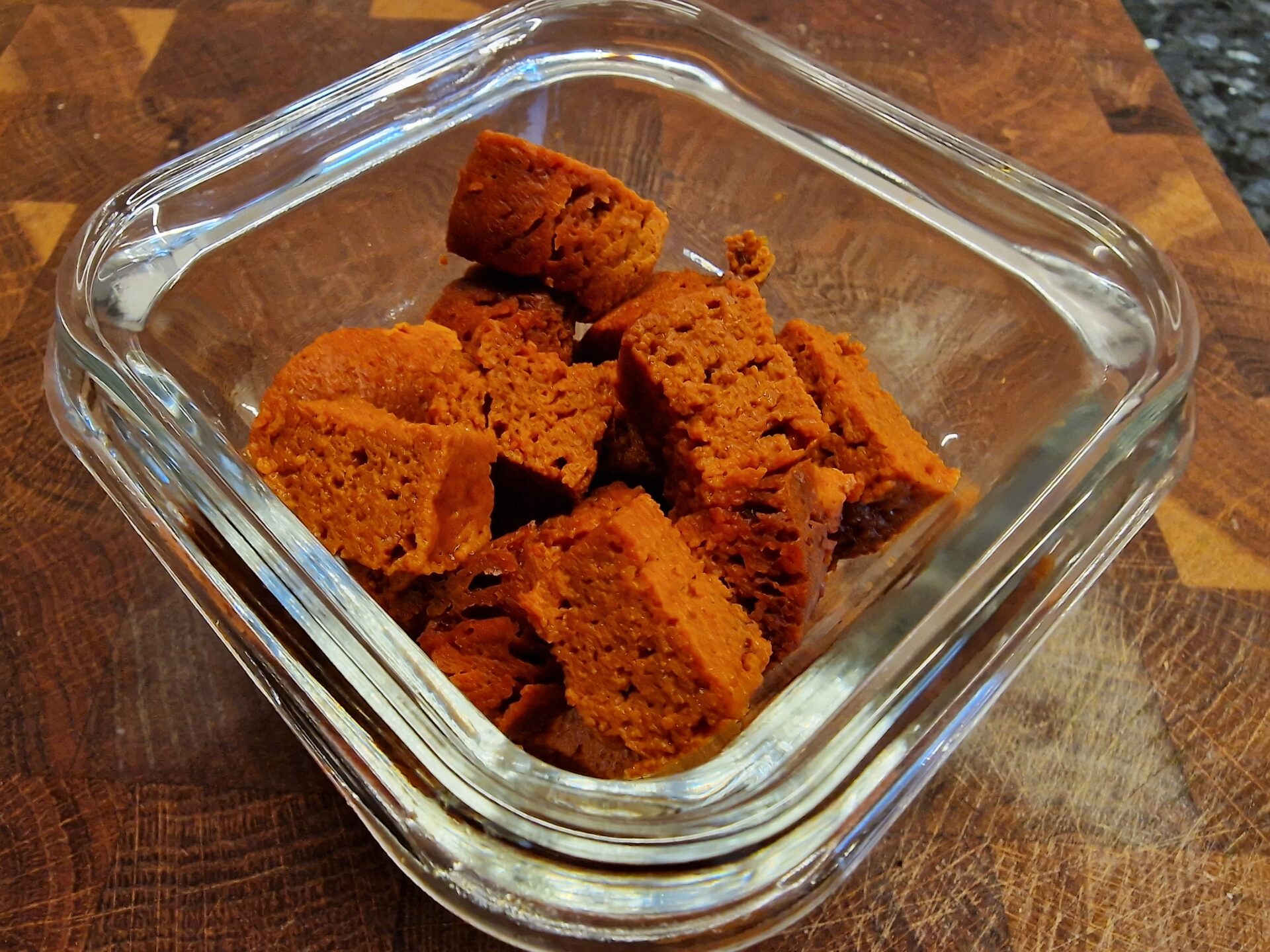 Den fertigen Eierstich aus der Form stürzen und in Würfel schneiden. Eine besondere Note gibt es, wenn kleine Sterne oder Herzen oder Ähnliches mit Mini-Keksformen ausgestochen werden.