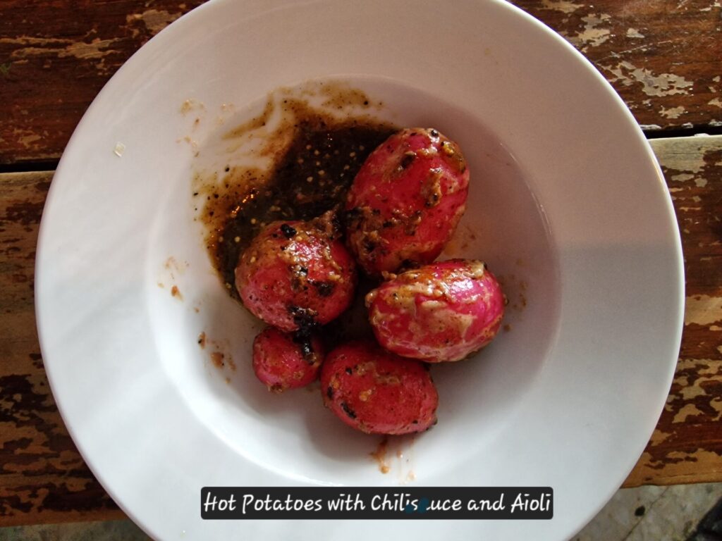 Kartoffeln noch warm mit Aioli und Chilisauce mischen und als Snack servieren. Kartoffeln mit roter Schale sorgen für den visuellen Effekt.