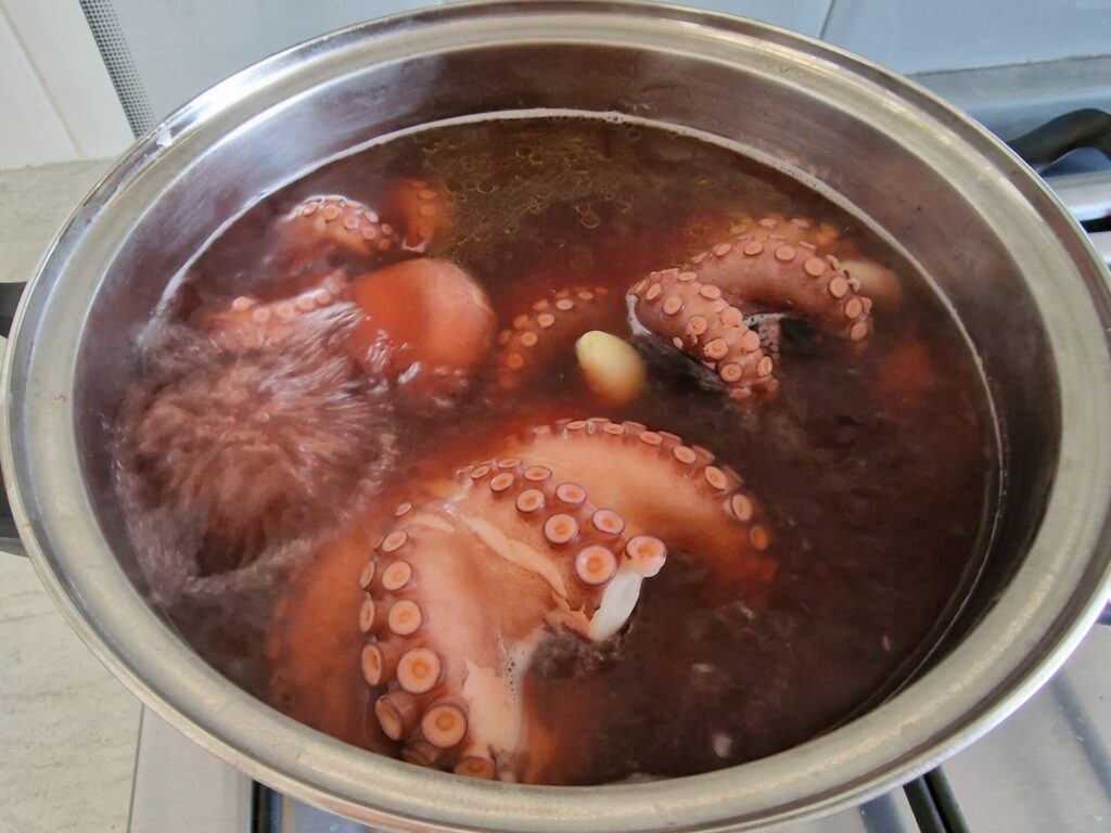 Wasser mit Knoblauch, Lorbeer, Salz und Olivenöl mit den optionalen Zutaten zum Kochen bringen. Oktopus dreimal rasch ins kochendem Wasser tauchen um das Fleisch abzuschrecken. Die zuvor hängenden Tentakel rollen sich dabei ein. Dann 35-40 Minuten simmern lassen (Faustregel: 20-25 Minuten pro 500 g; Achtung: Das Wasser darf dabei nicht mehr sprudelnd kochen, nur köcheln gerade unter 100°C). Das Fleisch erhält in dieser Zeit die typische rote Farbe. Im Anschluss kann das Fleisch aufgeschnitten und in kleinen Stücken serviert oder weiter verarbeitet werden.