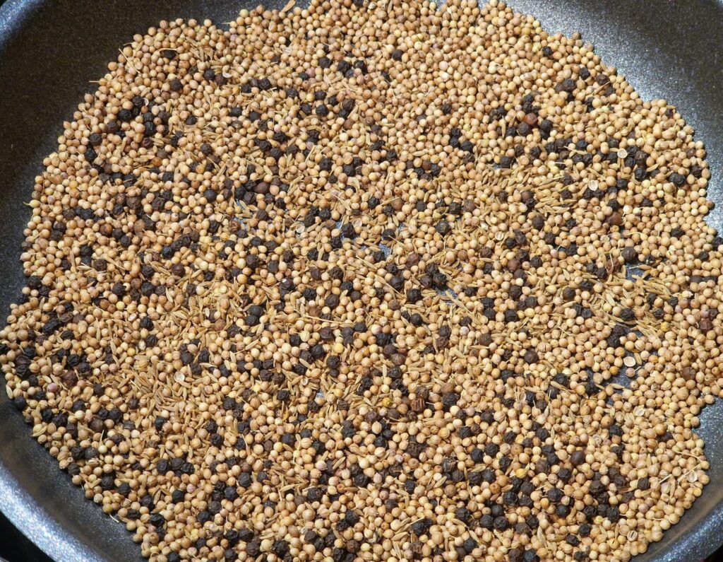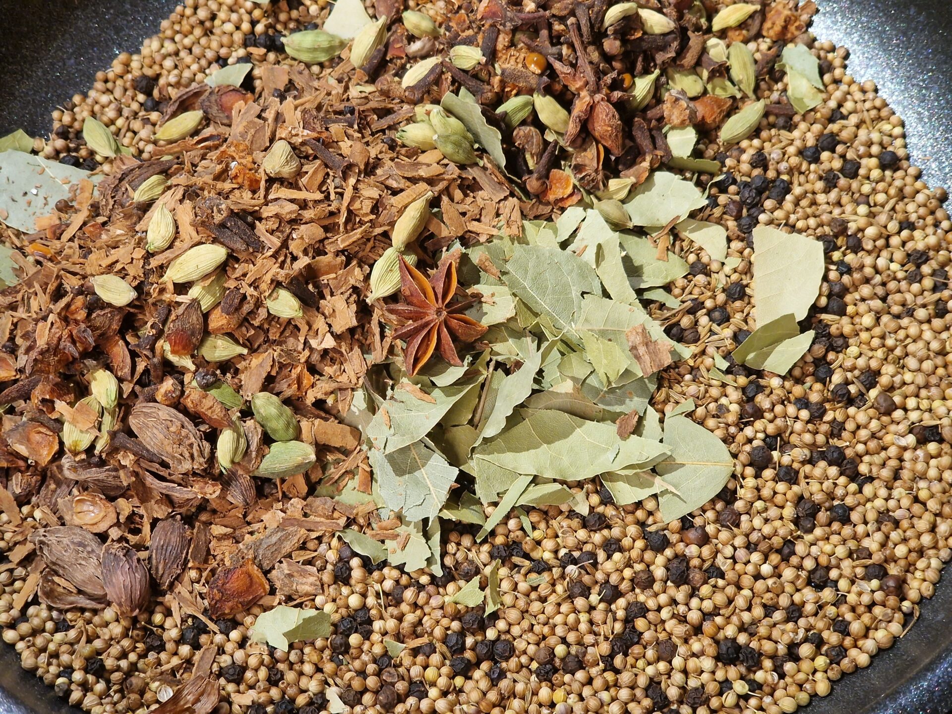Alle Zutaten in der Pfanne auf mittlerer Hitze mild anrösten, bis sie zu duften beginnen. Im Anschluss abkühlen lassen.