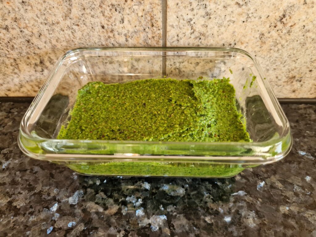 Pesto zum Schluss mit abgeriebener Zitronenschale, Salz und Pfeffer abschmecken.