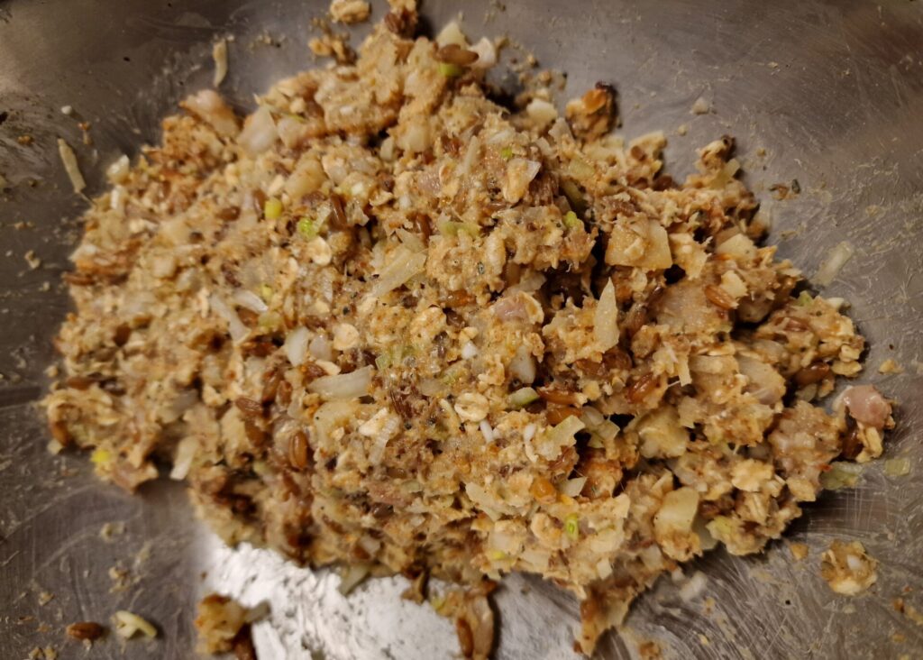 Eier, Semmelbrösel, Petersilie, Senf und Gewürze hinzufügen und alles gut durchmischen. Mit Salz und Pfeffer oder Chili abschmecken.
