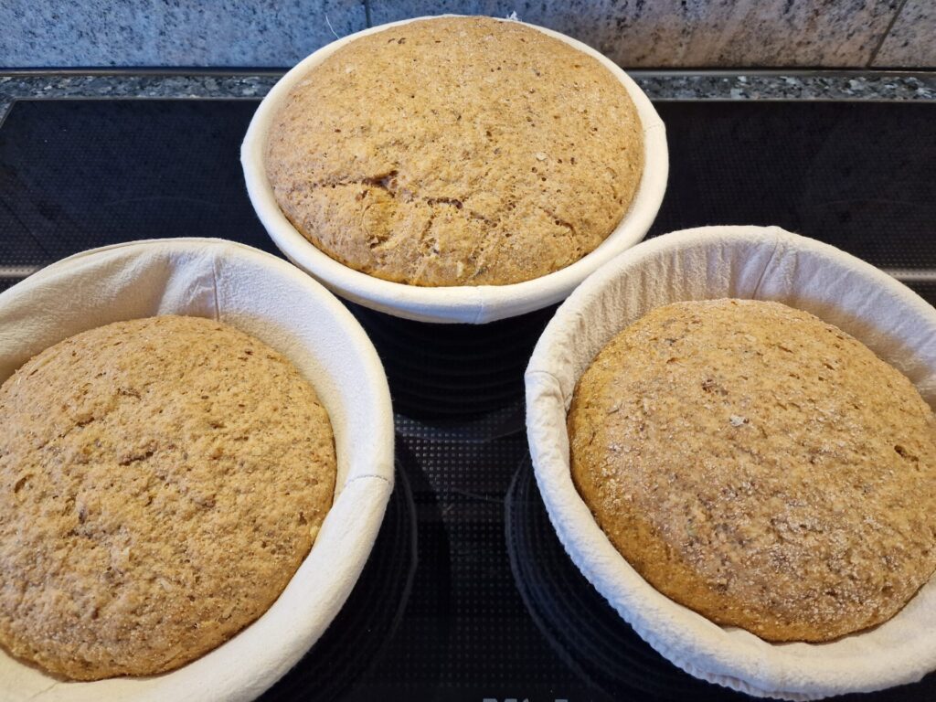 Teig mit Joghurt, Quark, Eiern, Gewürzen in der Küchenmaschine ausgiebig rühren lassen, bis er glatt und elastisch wird. Nach und nach das Mehl und die angebratenen Zwiebeln zugeben. Teigruhe 45 Minuten – bis der Teig sich in etwa verdoppelt hat. Wir nutzen für die Teigruhe 35°C und etwas Feuchtigkeit im Backofen. 3 Brote formen und gut bemehlt gehen lassen. Wir nutzen in diesem Rezept Gärkörbchen. Die Teigruhe beträgt wieder etwa 45 Minuten, oder bis der Teig sich verdoppelt hat (wieder bei 35°C bei etwas Feuchtigkeit im Backofen).