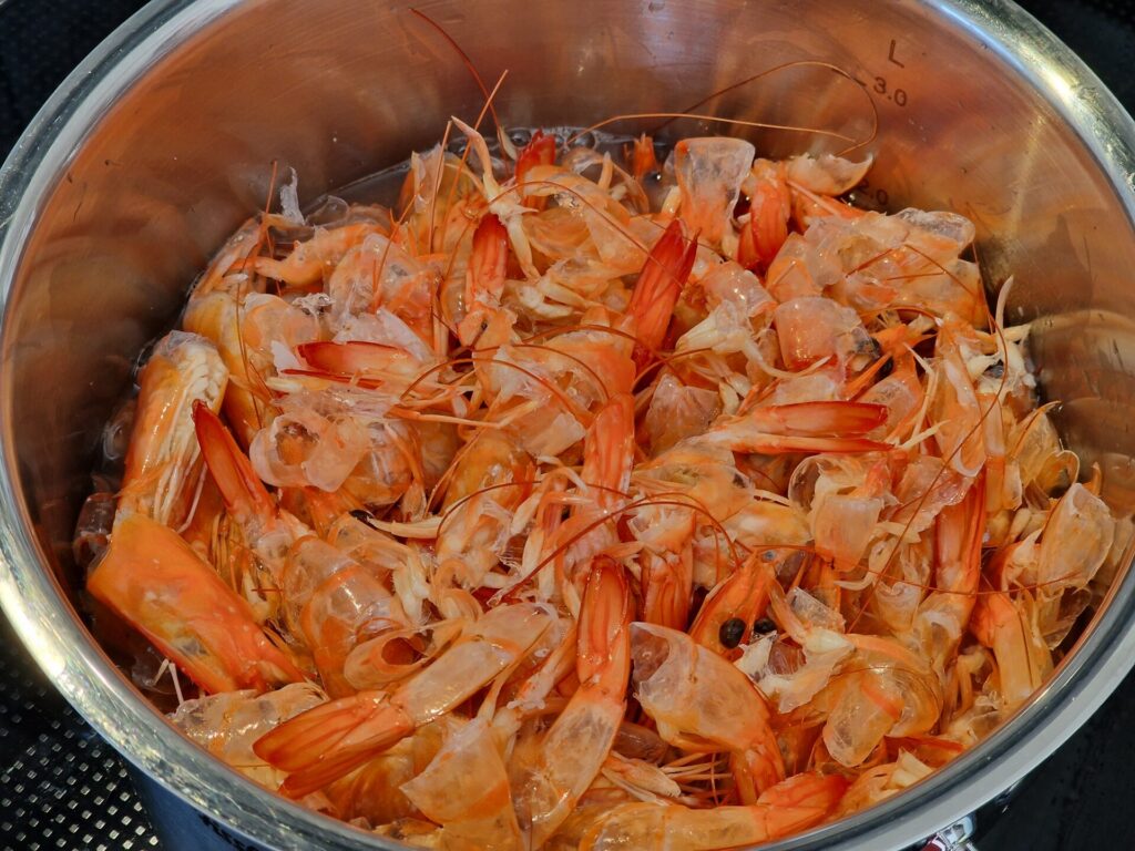 Für die Fischbrühe werden anschließend die Garnelenköpfe kurz aufgekocht, die Brühe durch ein Sieb gegossen und dann für das Risotto genutzt. Achtung: Das Protein in den Garnelenresten schäumt beim Aufkochen schnell auf, anschließend auf niedriger Hitze garen lassen um ein Überkochen zu vermeiden.