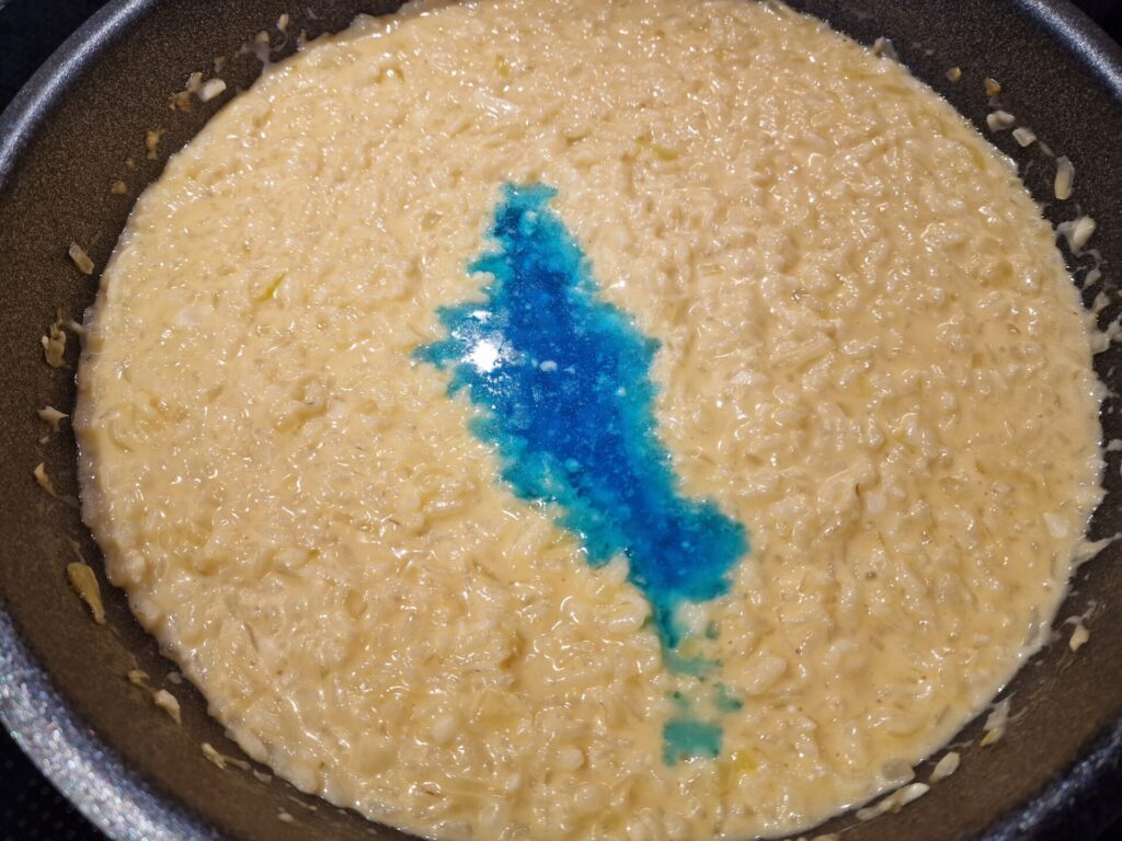 Meeresfrüchte hinzufügen und weitere zwei Minuten kochen. Mit Salz abschmecken, bei ausgeschalteter Hitze umrühren und mit dem blauen Curaçao die gewünschte Farbintensität hinzufügen.
