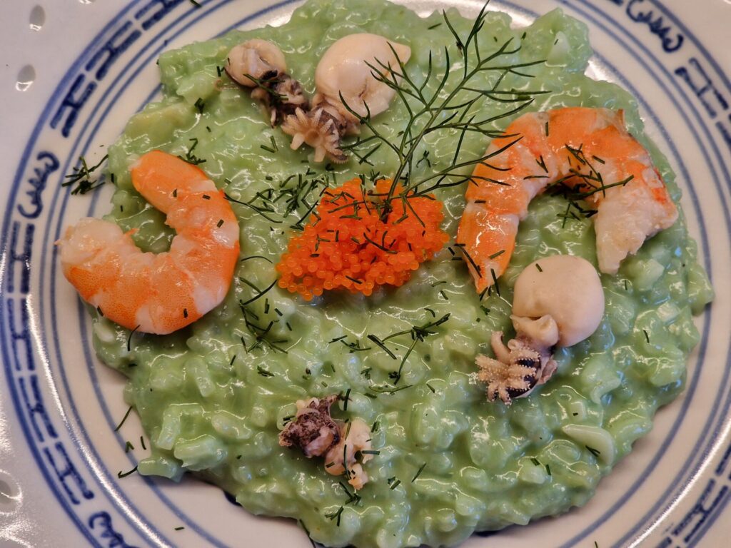 Das Gericht mit Reis und Meeresfrüchten kann als Hauptgang serviert werden. Aber auch beispielsweise als Vorspeise oder Fingerfood in kleinen Portionen serviert kann die blaue Farbe des Risottogerichtes mit der rötlichen Färbung der darauf garnierten Meeresfrüchte zusammen für eine Überraschung für’s Auge sorgen.