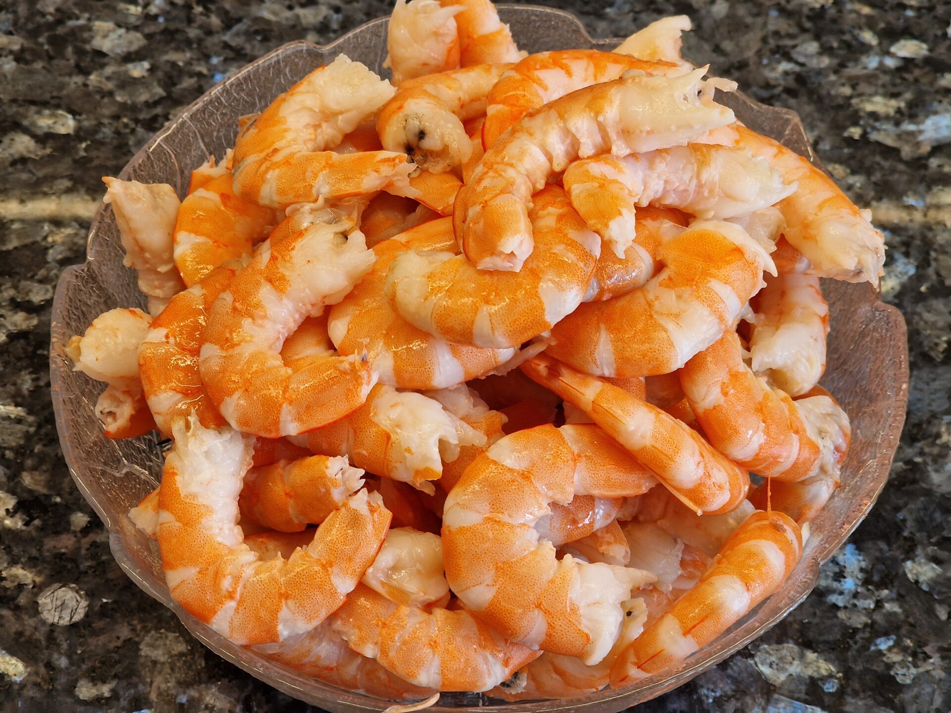 Garnelen säubern und abspülen, Köpfe – und bei vorgekochten Garnelen Panzer – entfernen und für die Zubereitung der Fischbrühe aufbewahren.