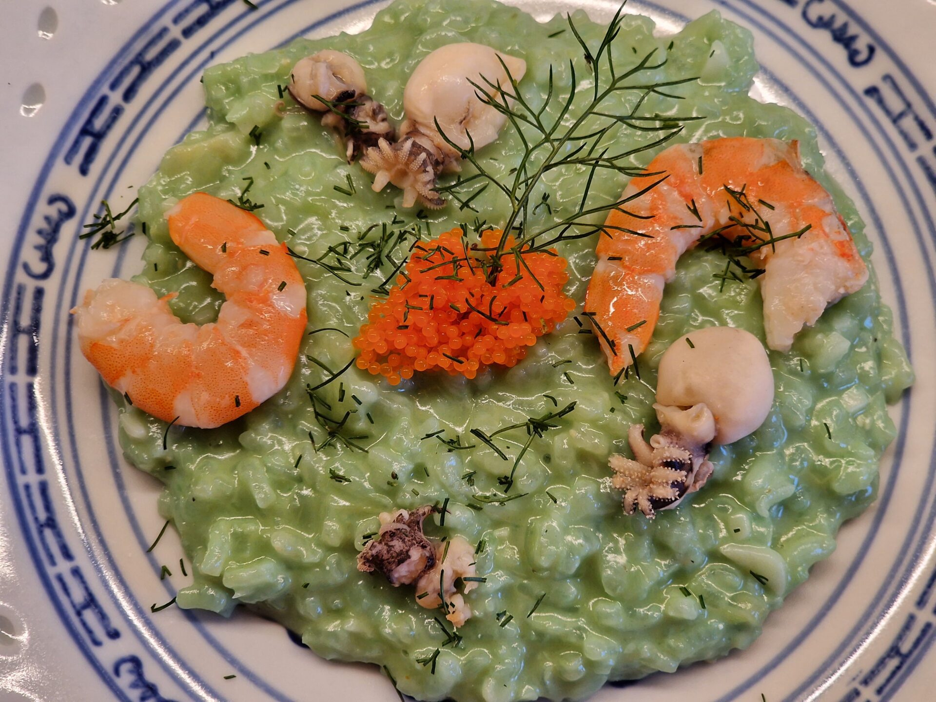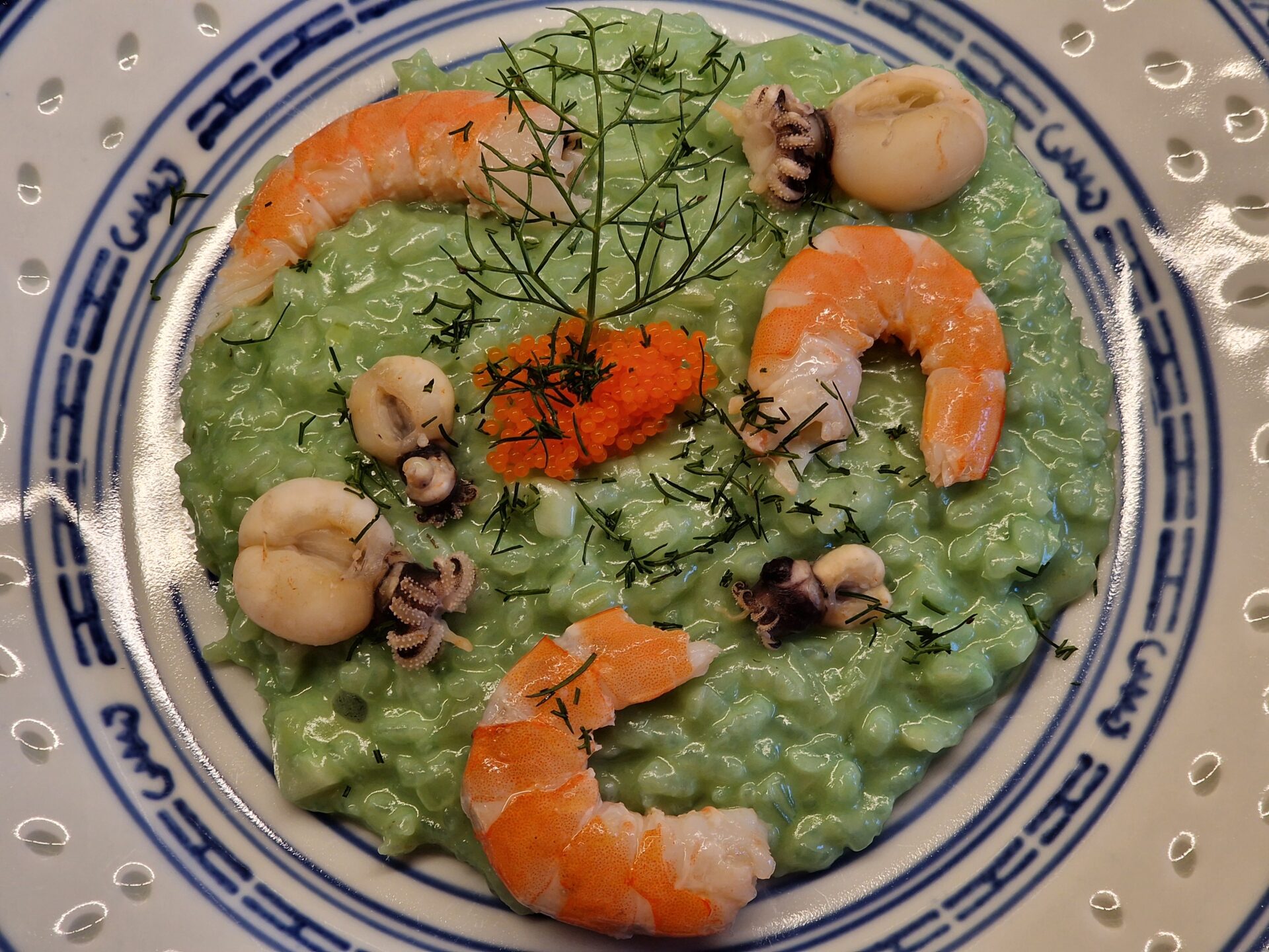 Risotto noch eine Minute ruhen lassen und dann mit den roten Garnelen, einigen der kleinen Tintenfische und dem roten Kaviar anrichten. Gewürzfenchel kann dabei noch einen Eindruck von Algen erwecken.