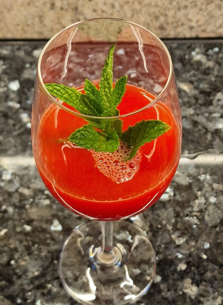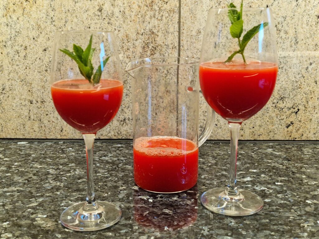 Melone halbieren, die Hälften nochmals teilen. Die Viertel weiter in handhabbare Spalten schneiden. Dann das rote Melonenfleisch in eine Schale geben, – die Kerne können drin bleiben – , dann pürieren. Im Anschluss durch ein Sieb geben. Den Limettensaft zugeben. Die Gläser zum Servieren mit Pfefferminzstängeln dekorieren. Genießen.