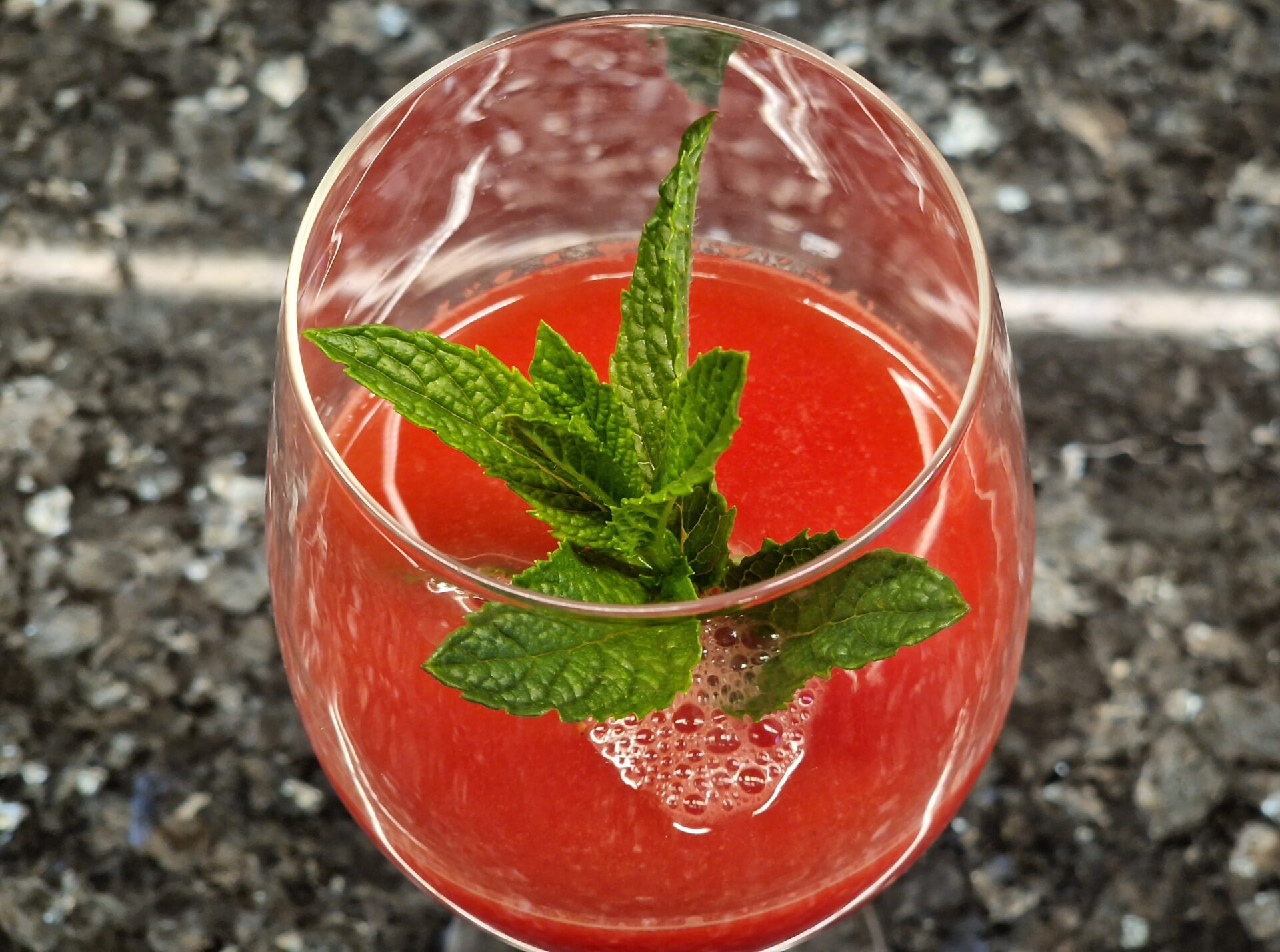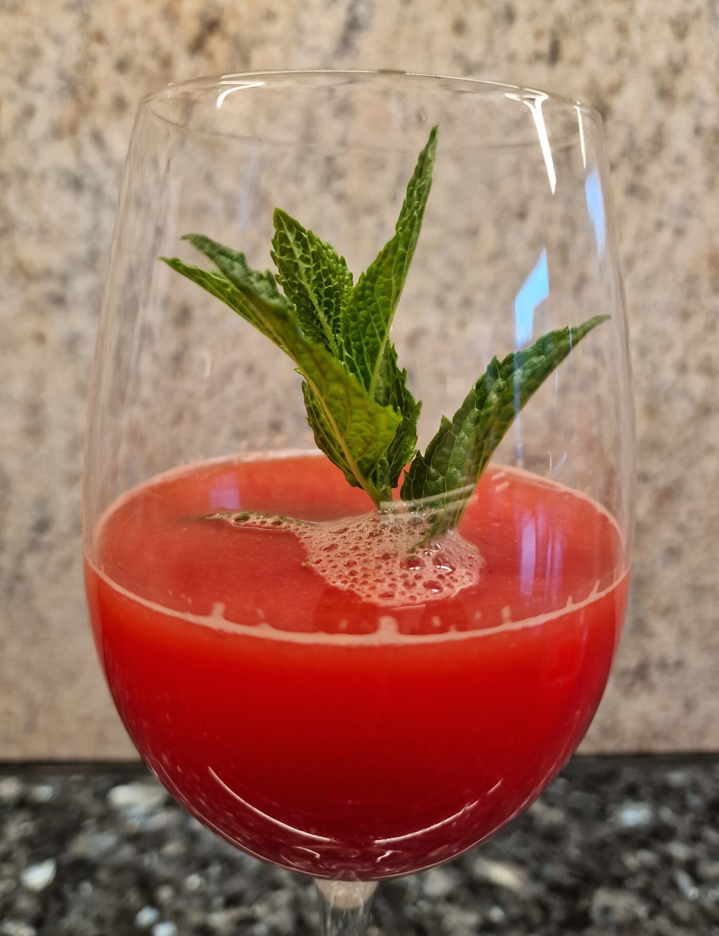 Melone halbieren, die Hälften nochmals teilen. Die Viertel weiter in handhabbare Spalten schneiden. Dann das rote Melonenfleisch in eine Schale geben, – die Kerne können drin bleiben – , dann pürieren. Im Anschluss durch ein Sieb geben. Den Limettensaft zugeben. Die Gläser zum Servieren mit Pfefferminzstängeln dekorieren. Genießen.