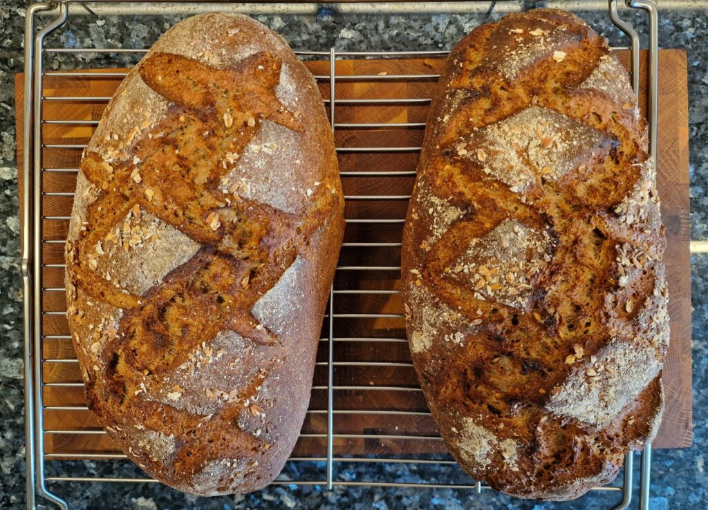 Teig auf eine bemehlte Arbeitsfläche vorsichtig stürzen, zweimal falten (einschlagen) und zu zwei runden Teigkugeln oderlänglichen Broten kneten, auf ein mit Backtrennpapier ausgelegtes Backblech geben. Zur Dekoration mit Mehlresten, ein paar gequetschten Haferflocken bestreuen, kreuzweise einschneiden. Die zweite Teigruhe beträgt noch etwa 20 Minuten.