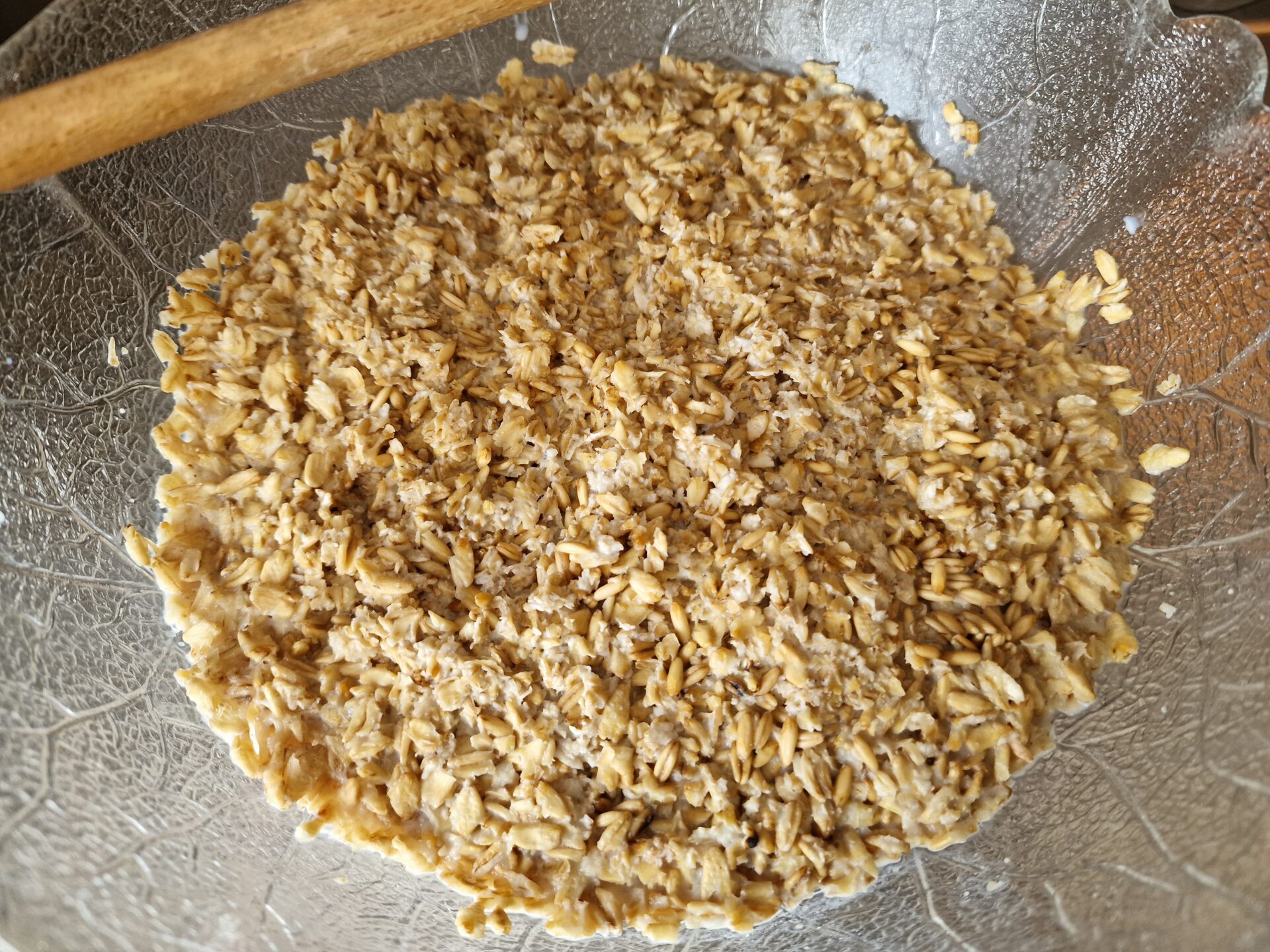 Kernige Haferflocken in der Flockenquetsche quetschen. Ein zweiter Quetschgang macht die Flocken zart. Aus Flocken und Hafer in 300 ml Wasser einen Haferbrei herstellen und quellen lassen (Mikrowelle, 850 W, 2-3 Minuten, bis es nach Haferbrei zu duften anfängt) und abkühlen lassen, bis er handwarm ist. Ist der Brei-im Anschluss zu fest, etwas Flüssigkeit nachgeben.