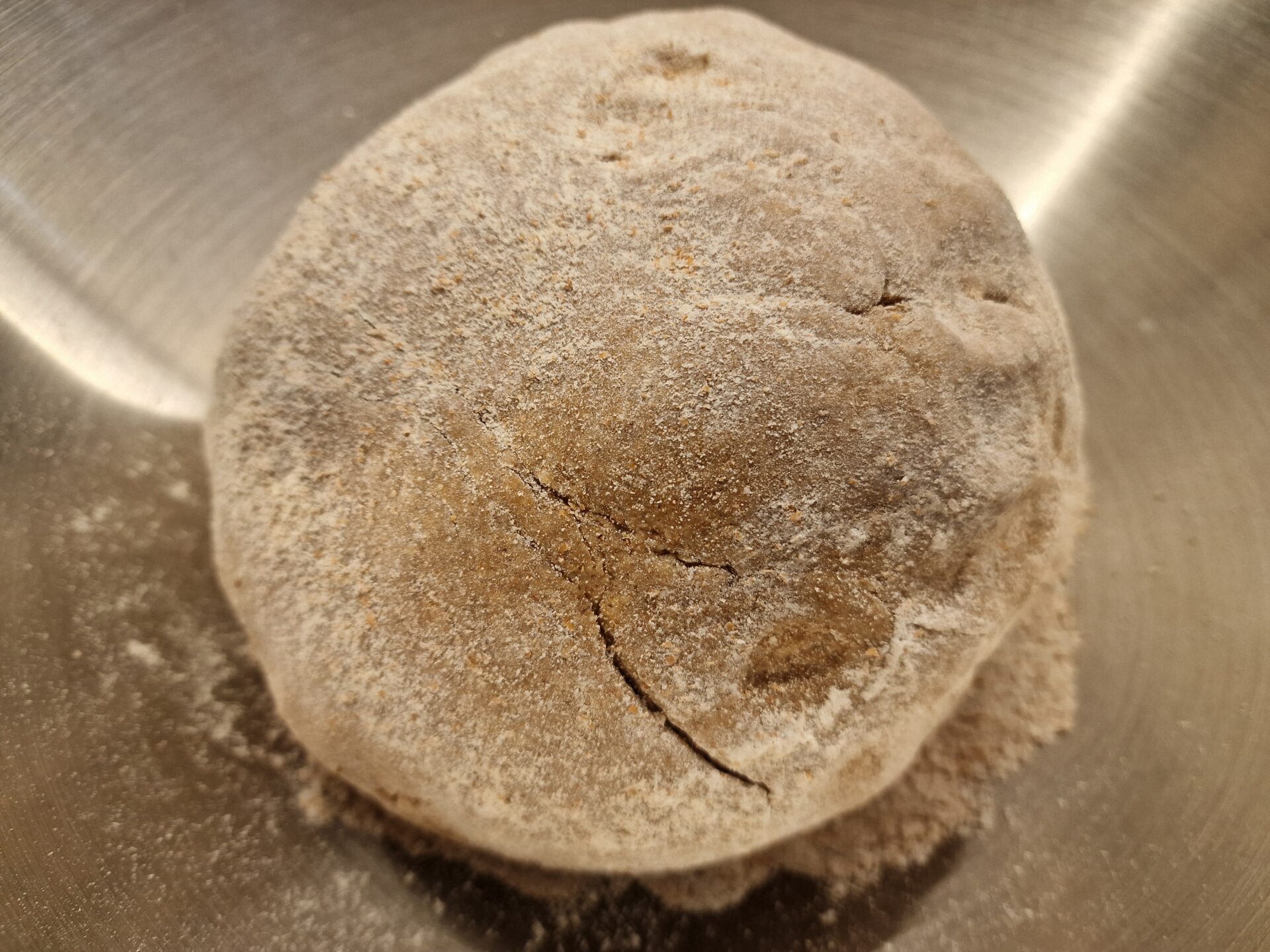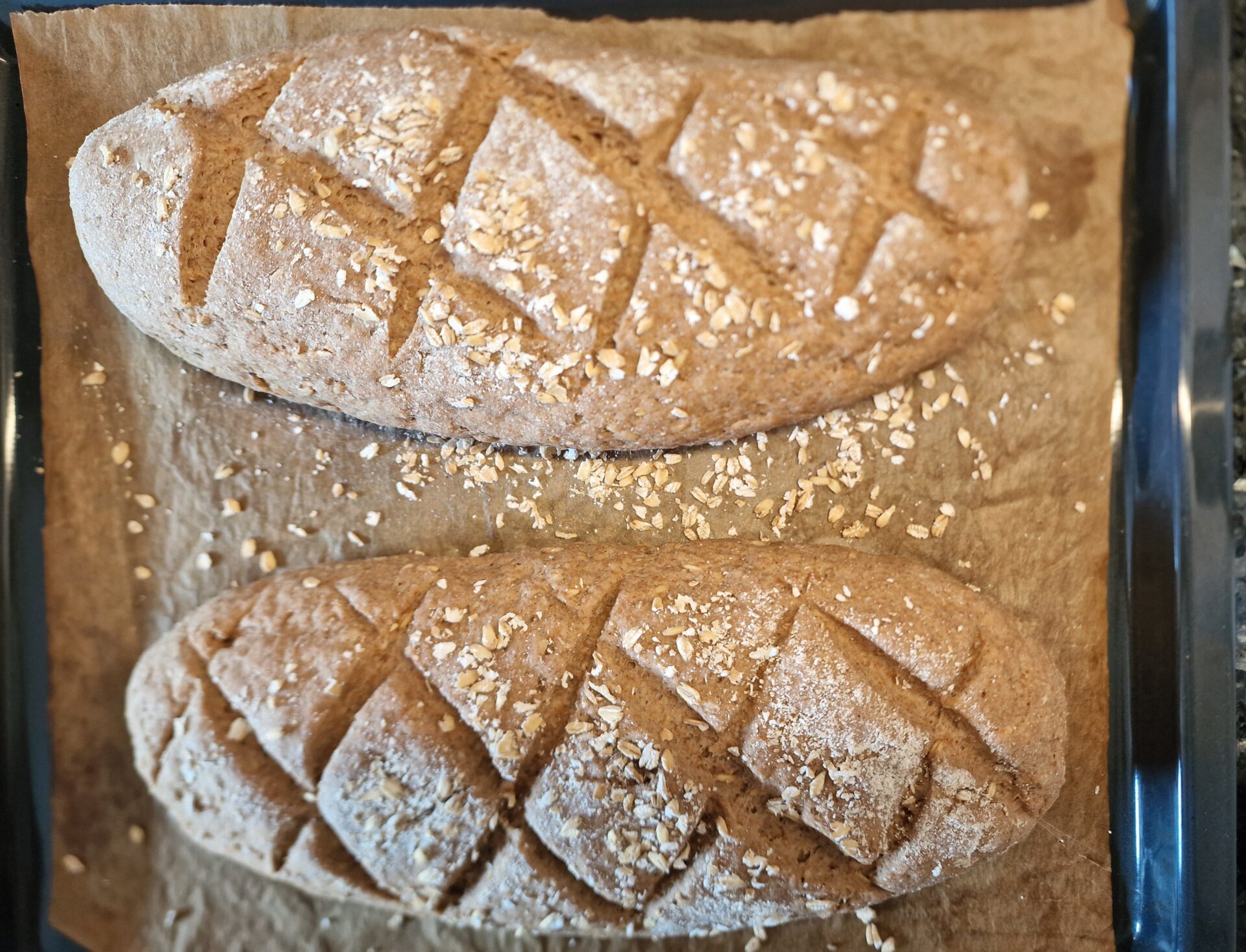 Teig auf eine bemehlte Arbeitsfläche vorsichtig stürzen, zweimal falten (einschlagen) und zu zwei runden Teigkugeln oderlänglichen Broten kneten, auf ein mit Backtrennpapier ausgelegtes Backblech geben. Zur Dekoration mit Mehlresten, ein paar gequetschten Haferflocken bestreuen, kreuzweise einschneiden. Die zweite Teigruhe beträgt noch etwa 20 Minuten.