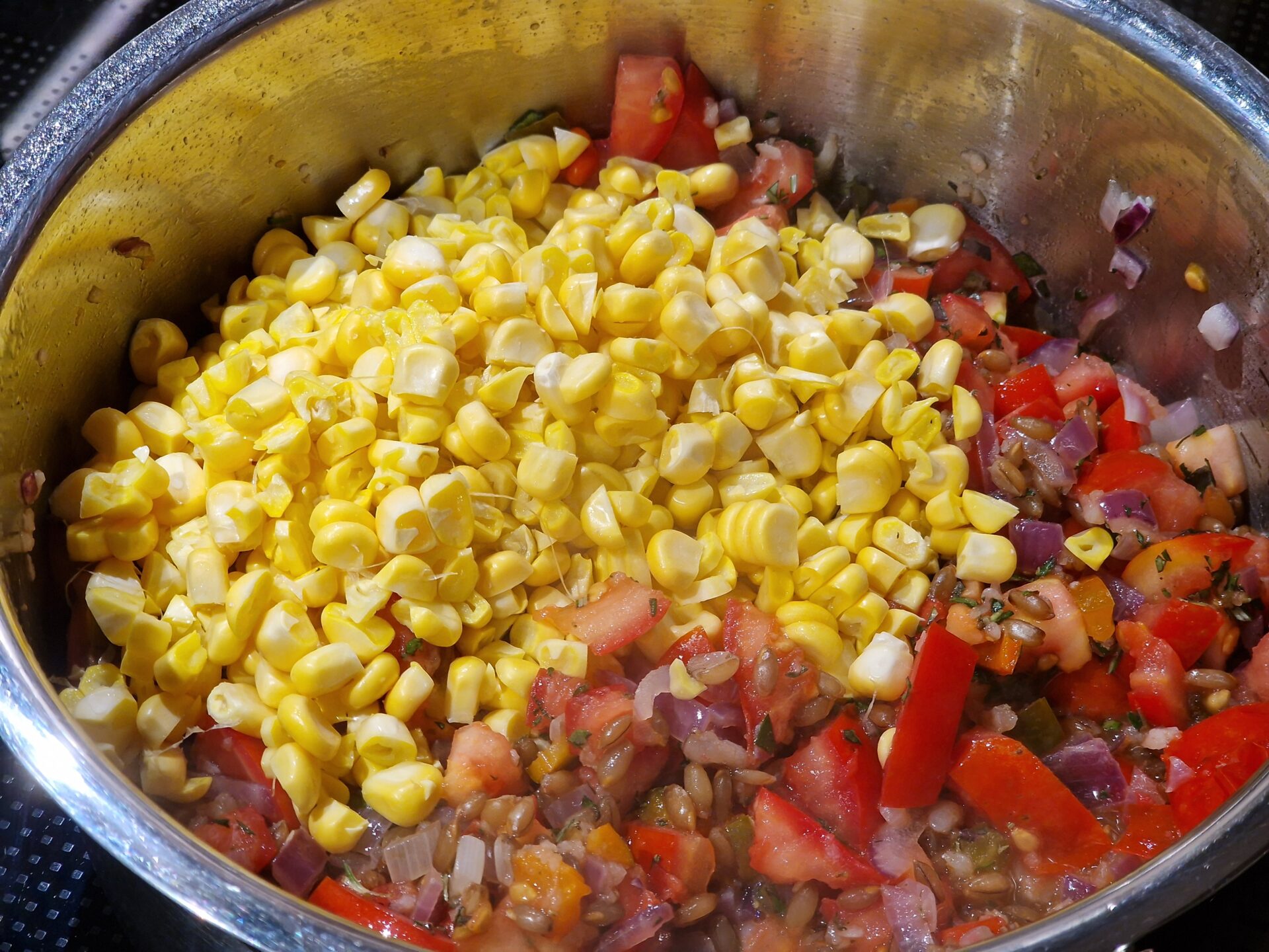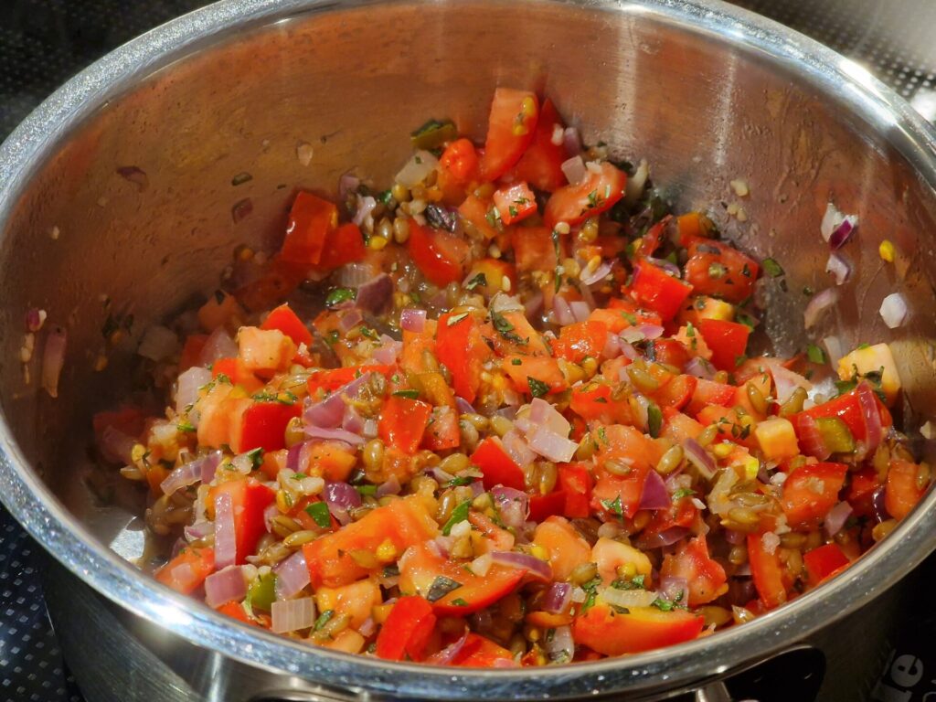 Peperoni ohne Öl anbraten, dann Olivenöl und Knoblauch zugeben, Zwiebeln folgen lassen. Chili, Tomaten, zum Schluss Roggenkörner und Maiskörner zugeben, 10 Minuten etwa köcheln lassen. Mit Marsala abschmecken.