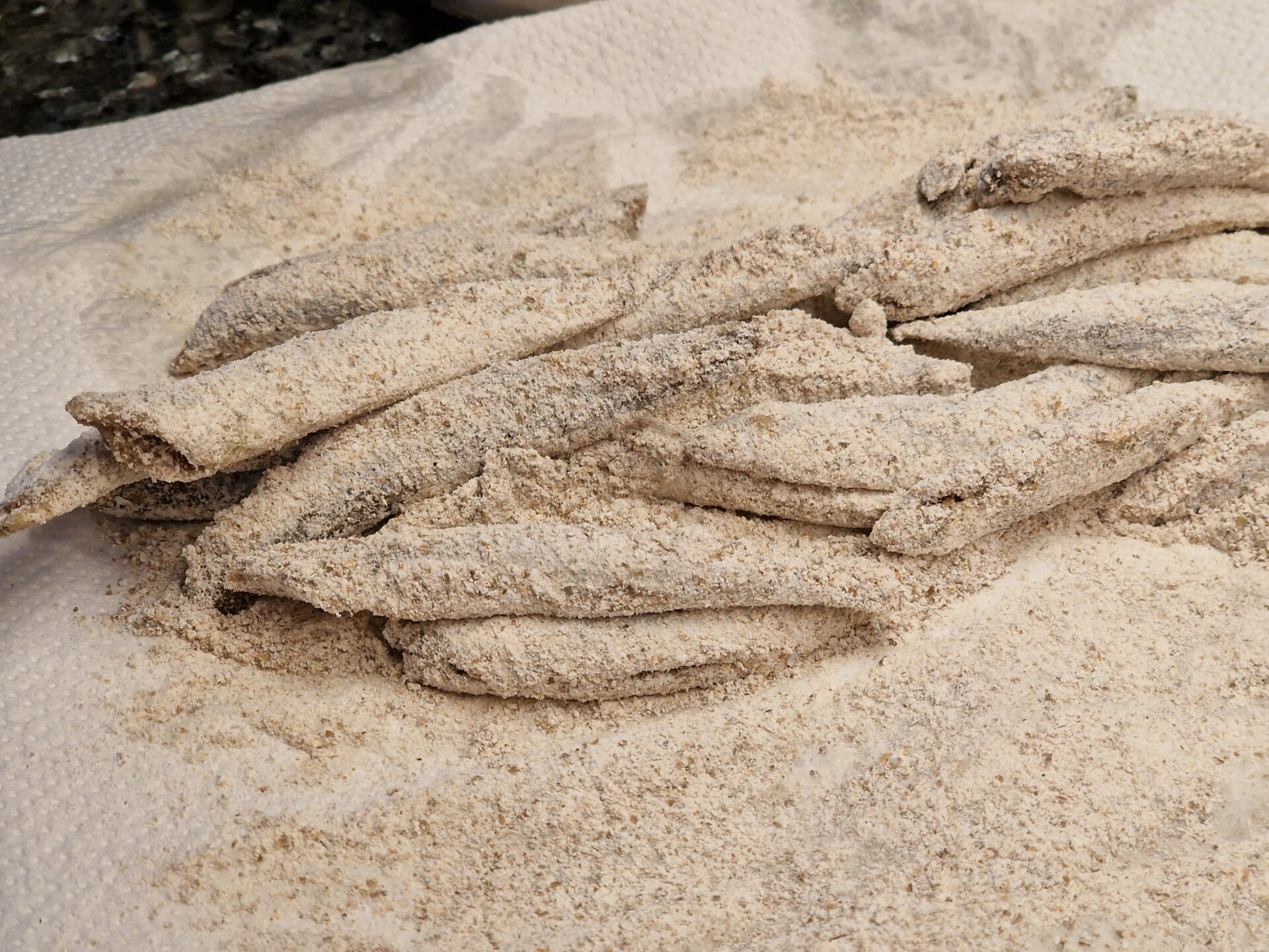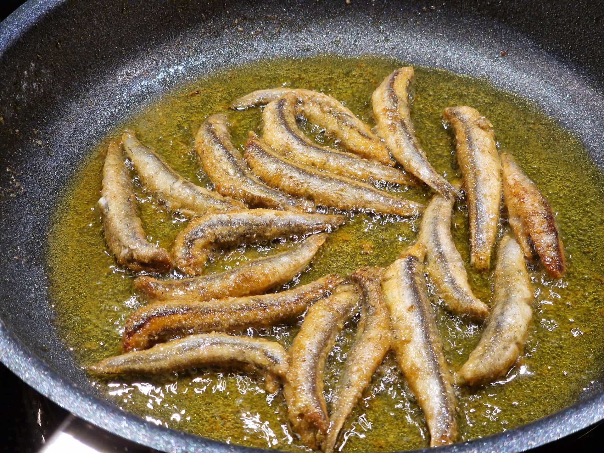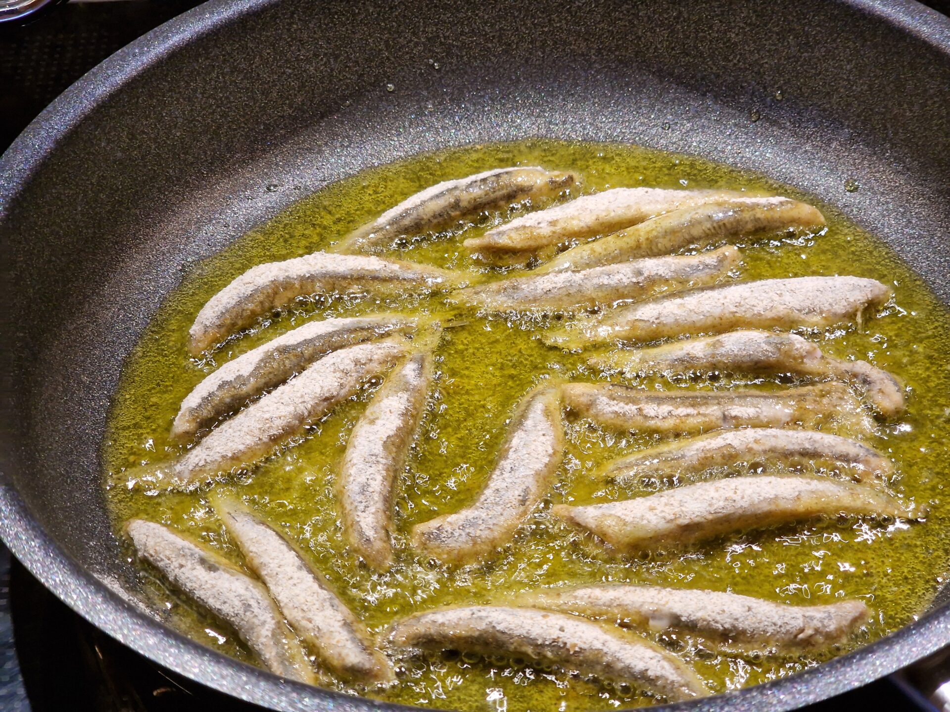 Sardellen säubern, säuern, salzen, trocken tupfen, in Roggenmehl leicht wälzen. In Olivenöl separat kross anbraten.
