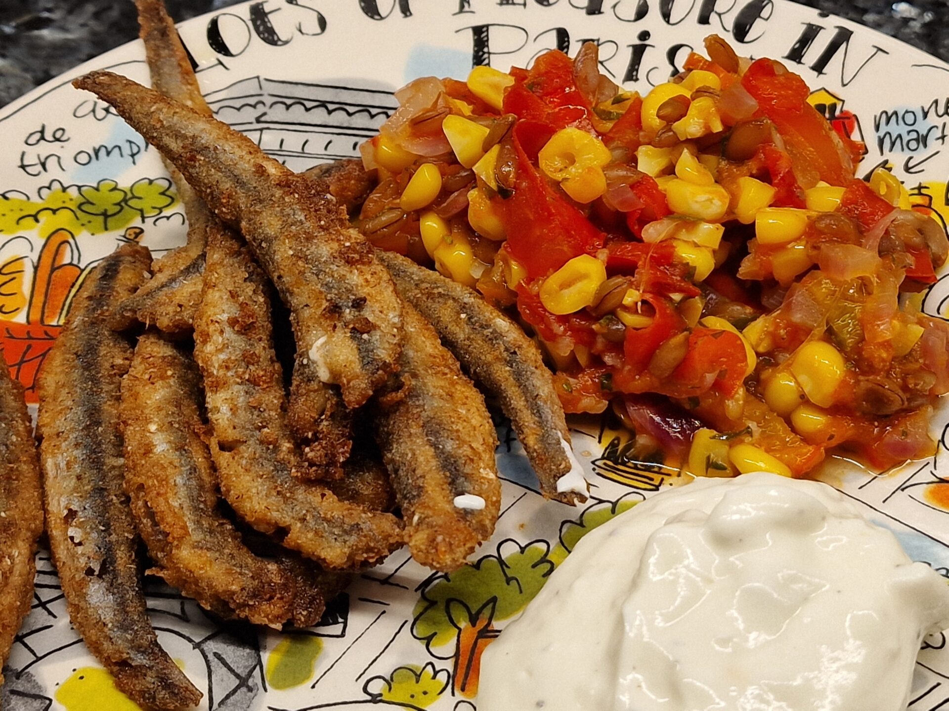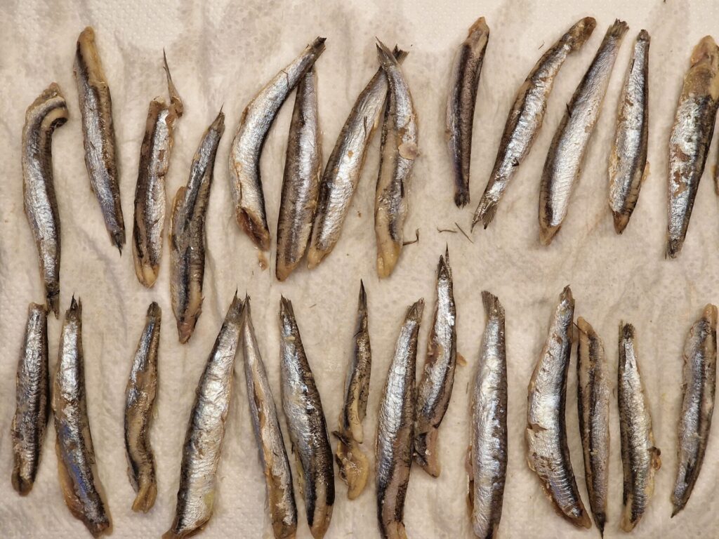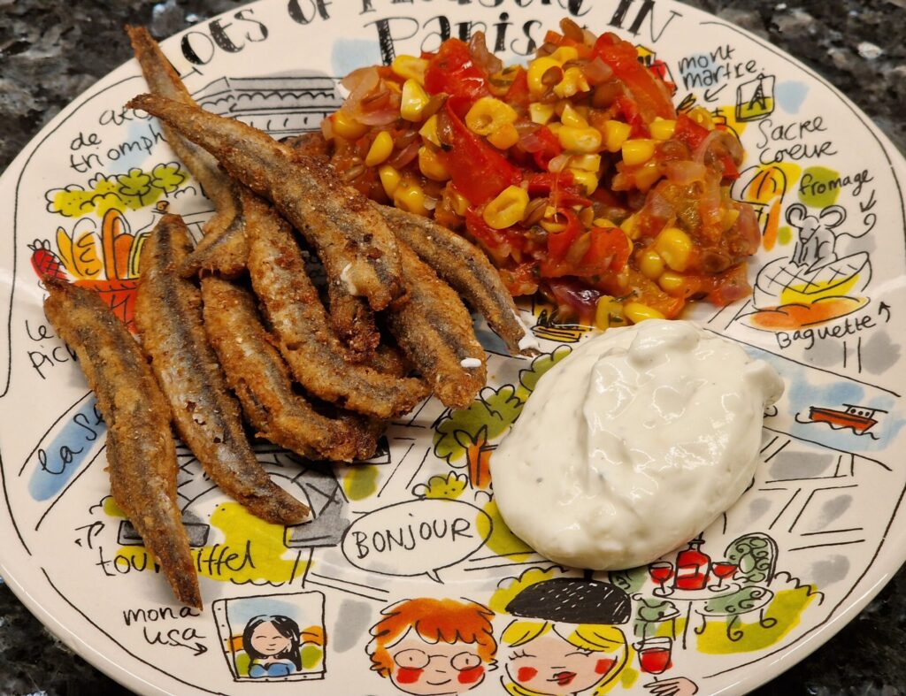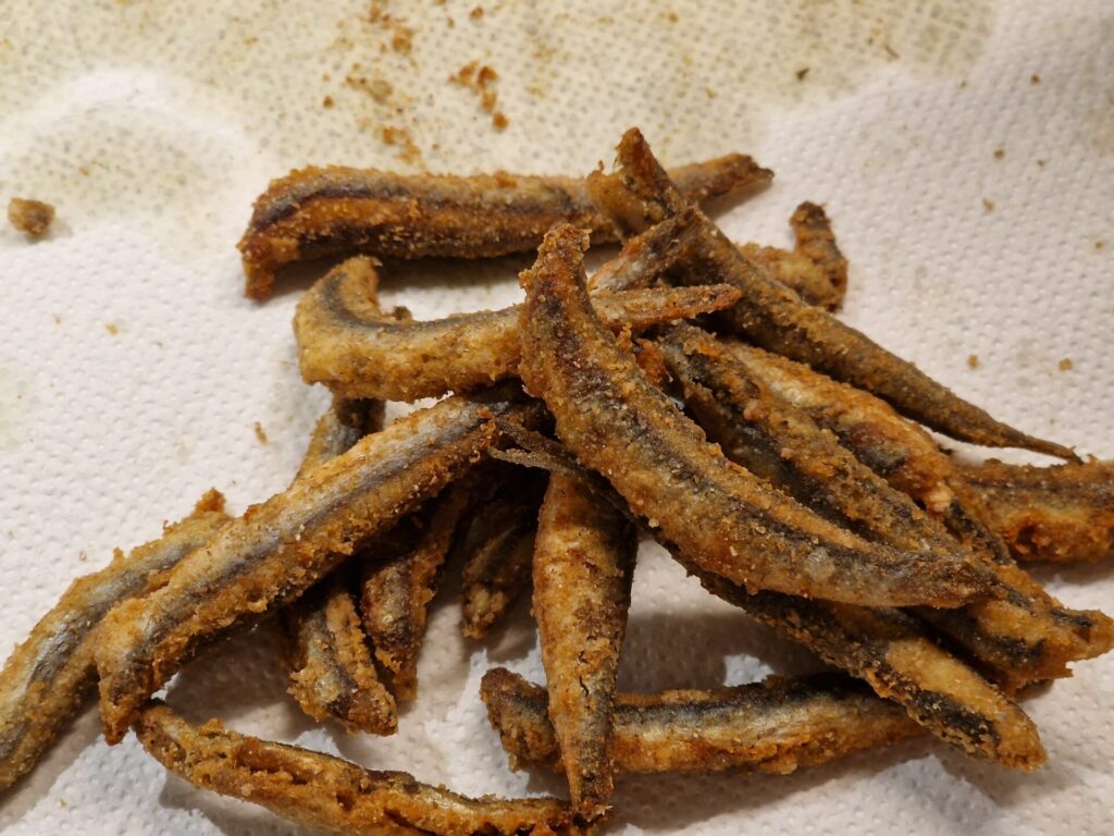 Sardellen säubern, säuern, salzen, trocken tupfen, in Roggenmehl leicht wälzen. In Olivenöl separat kross anbraten.