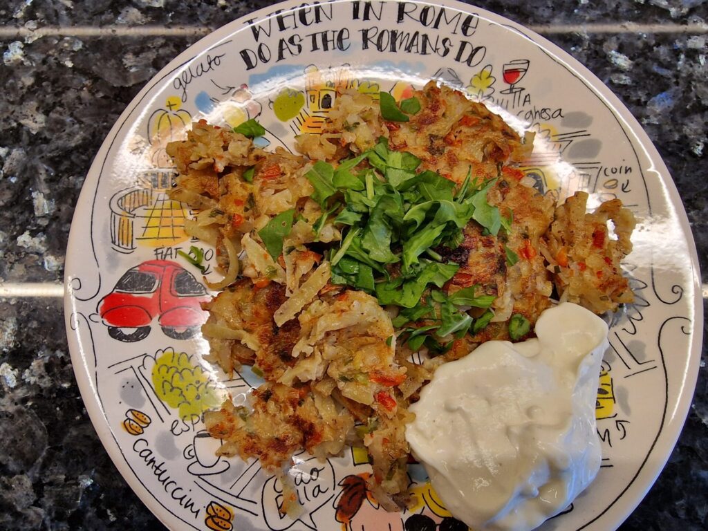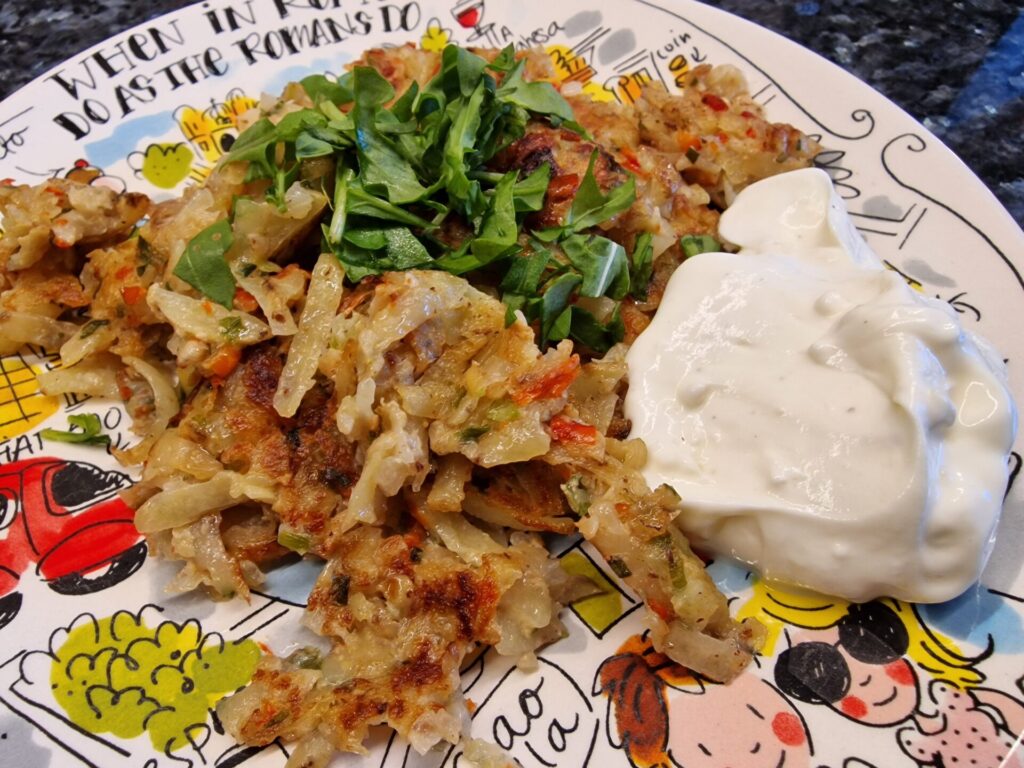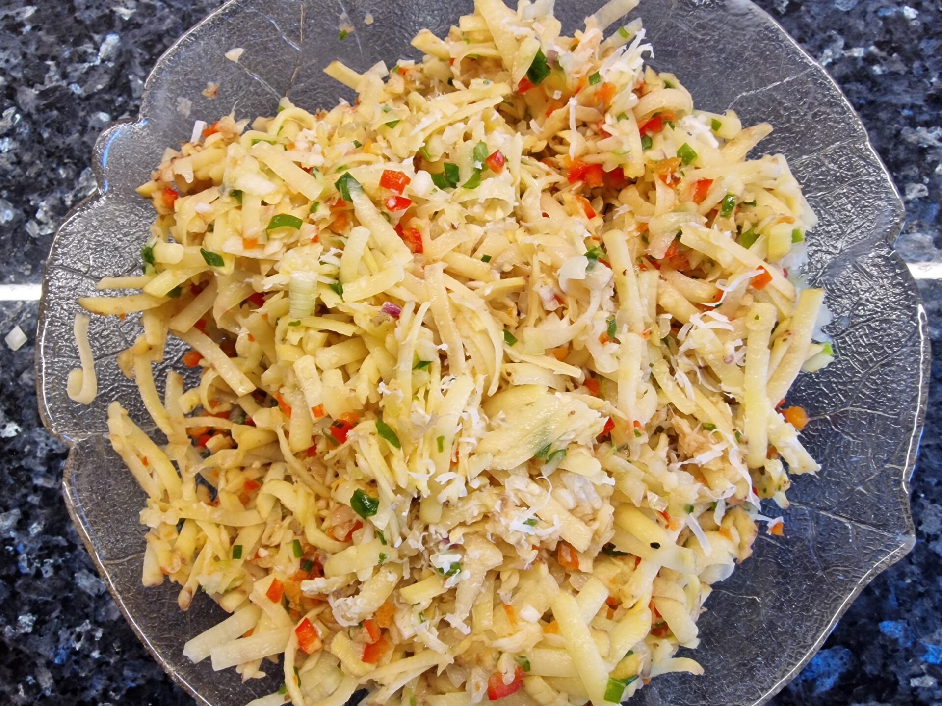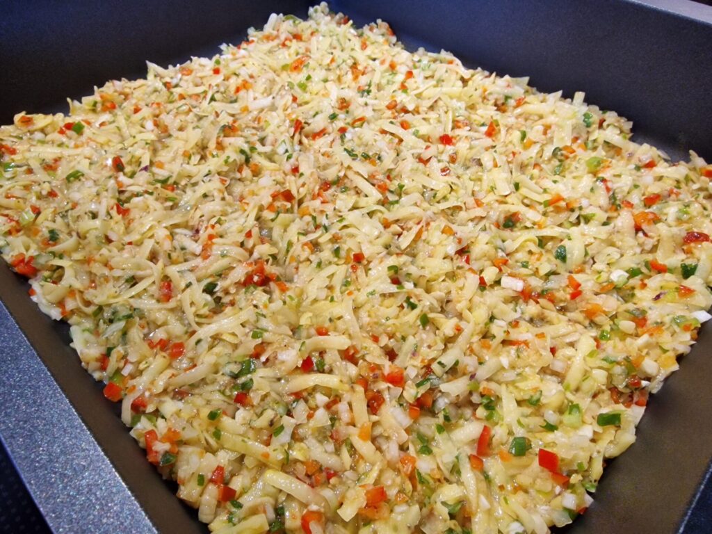 Alle Zutaten durch den Gemüsewolf drehen (grober Vorsatz), mischen und in einer großen Pfanne mit dem heißem Olivenöl ganz langsam goldbraun rösten, etwa 30 Minuten.