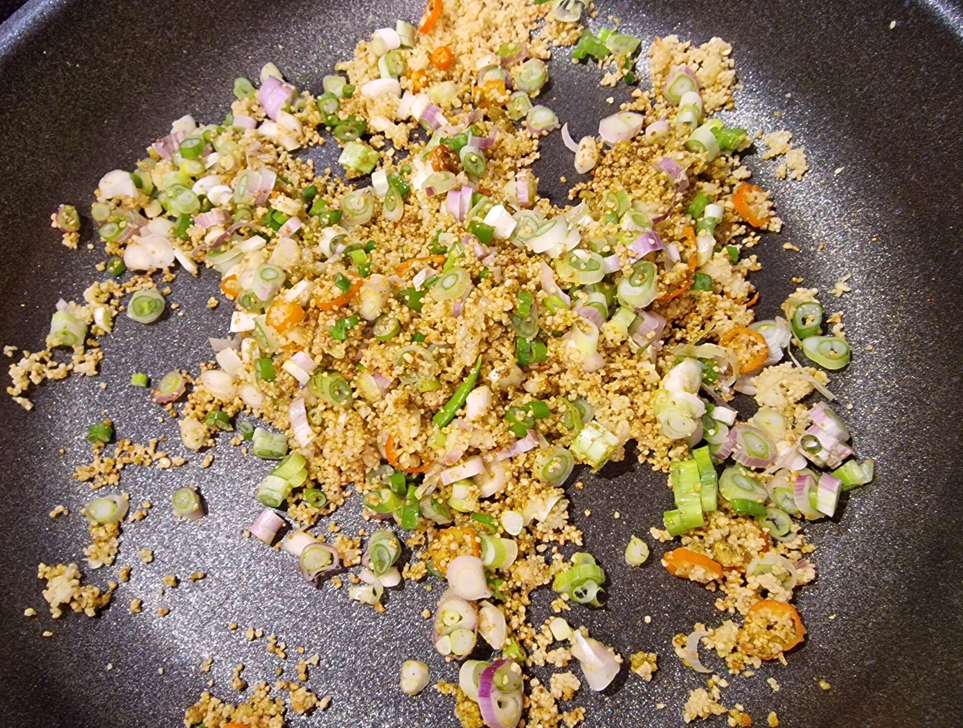 Couscous mit dem restlichen Knoblauch, etwas Salz, dem weißen Stängel der Frühlingszwiebeln und Chili und in der Pfanne unter Rühren 4-5 Minuten anrösten. Nun kochendes Wasser und Instant Brühe zugeben, zügig umrühren und abgedeckt etwa 5 Minuten lang garen, bis der Couscous weich ist (Garzeit ist sortenabhängig). Ganz zum Schluss der Garzeit den grünen Teil der Frühlingszwiebeln einmischen.
