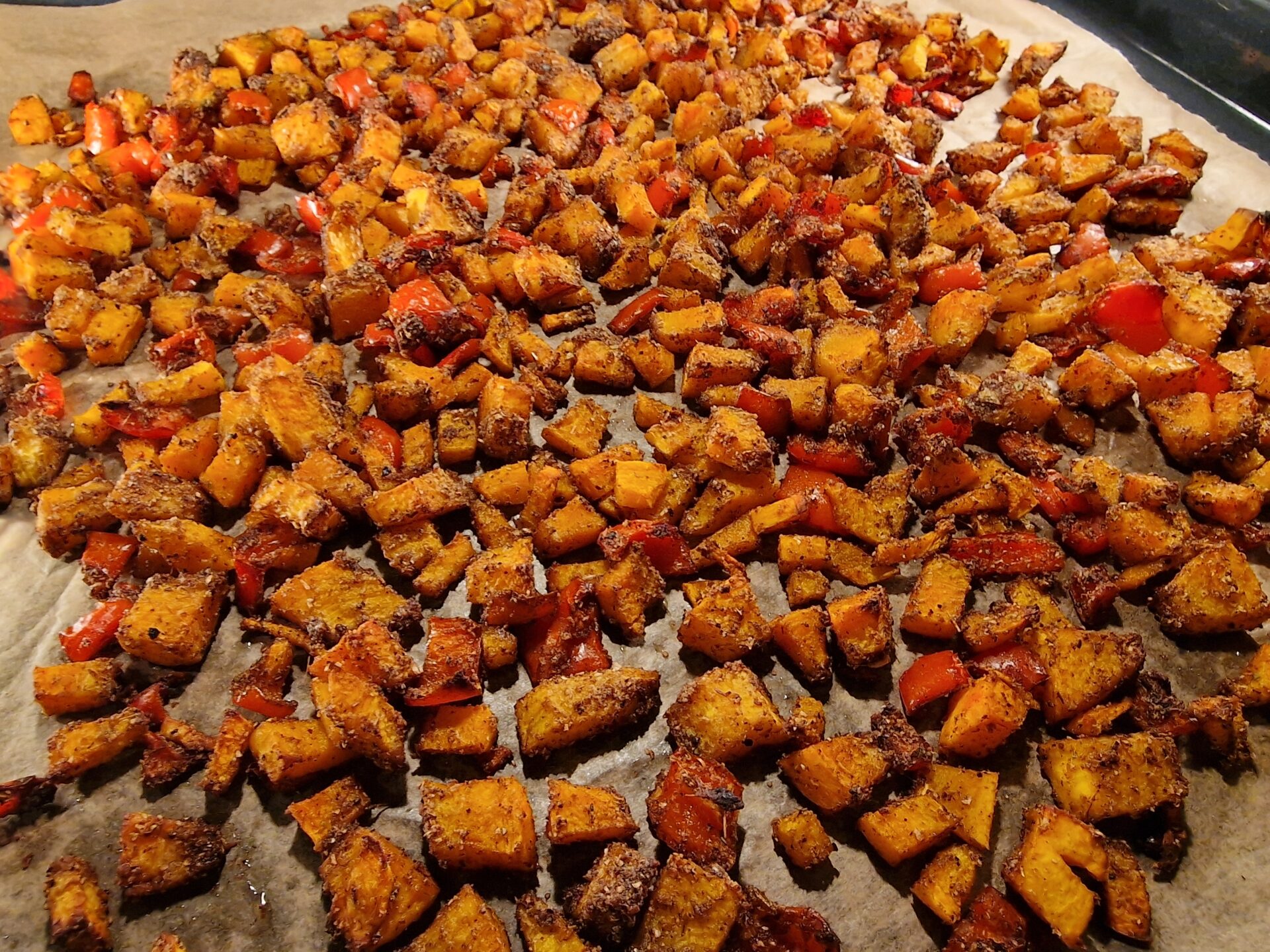 Paprika und Kürbis mit Kreuzkümmel, Garam Masala, Salz, Pfeffer und 1 Esslöffel Olivenöl mischen. Alles auf ein mit Backtrennpapier ausgelegtes Backblech geben und im vorgeheizten Backofen auf 180°C (Umluft) 20-25 Minuten backen, bis der Kürbis goldbraun und weich ist. Während des Garens das Gargut auf dem Blech gegebenenfalls ein- bis zweimal schütteln, um es zu wenden.