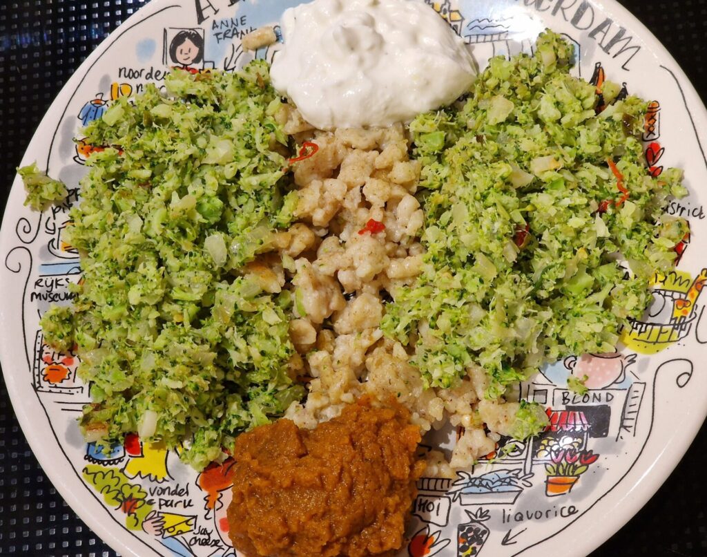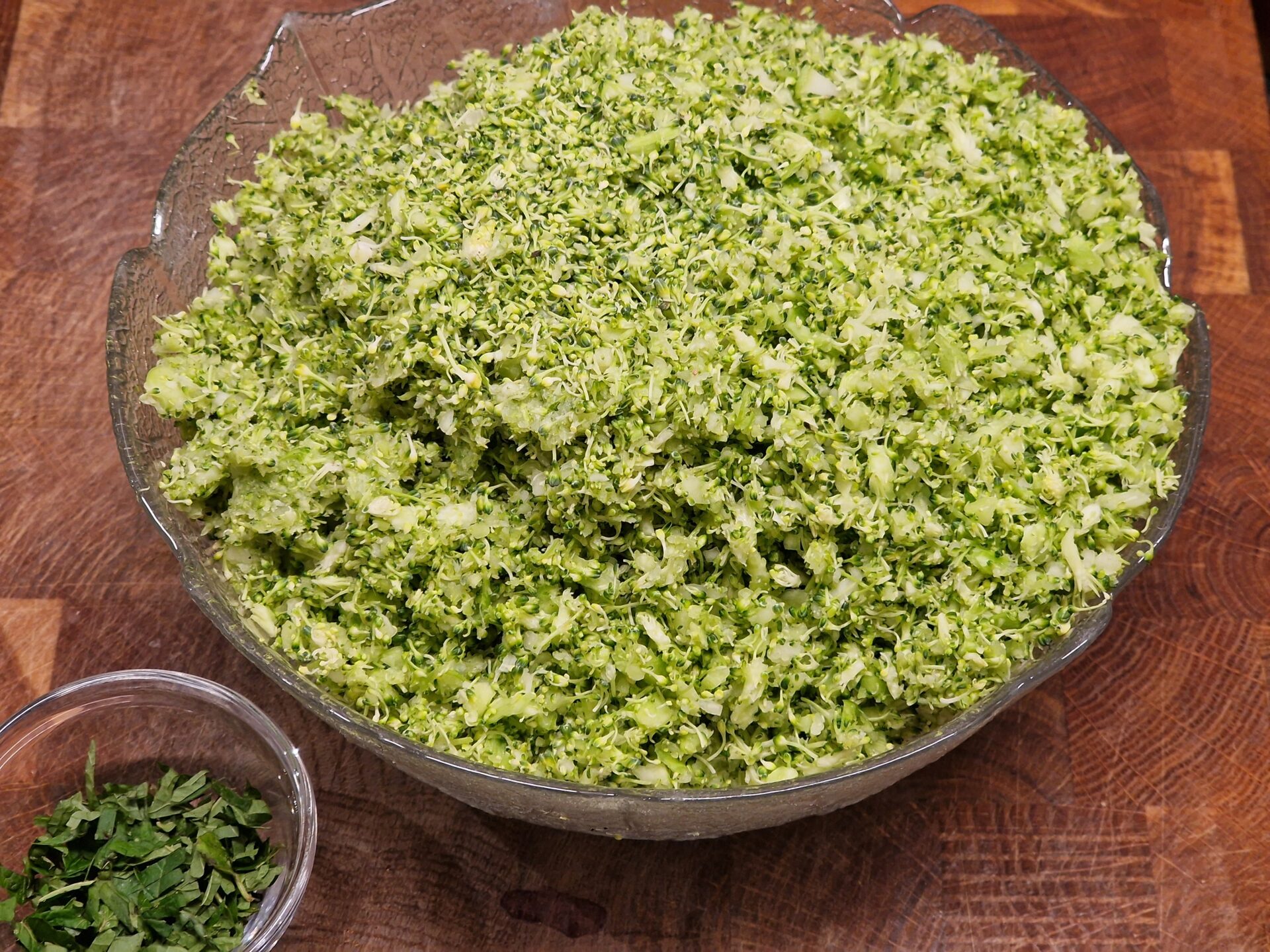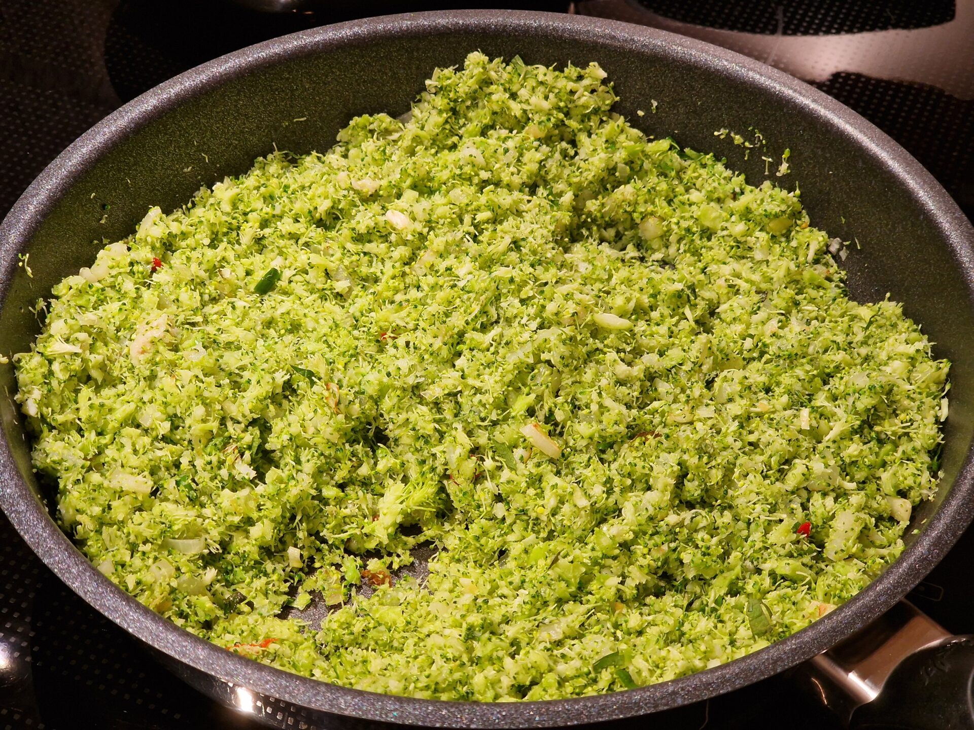 Broccoli in 2×2 cm gleichgroße Stücke teilen, diese in der Küchenmaschine pulsieren, bis der Brokkoli in kleine, reisgroße Stücke zerfällt., was etwa 2 Tassen „gereisten” Brokkoli ergibt.