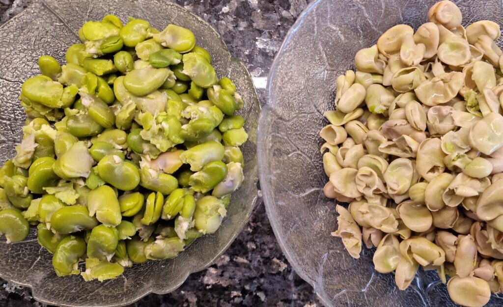 Frische Favabohnen haben eine zähe, weißliche, recht dünne Haut um den hellgrünen Kern. Jede frische Bohne muss nach dem Blanchieren in Sazwasser – etwa 8 Minuten – einzeln aus dieser Hülle geschnipst werden, es schmeckt so besser. Dafür müssen sie nicht über Nacht eingeweicht werden. Für eine Falafel Herstellung sind sie allerdings nicht so geeignet, meist bleibt die Teigmasse zu feucht und die Falafel zerfallen leicht.