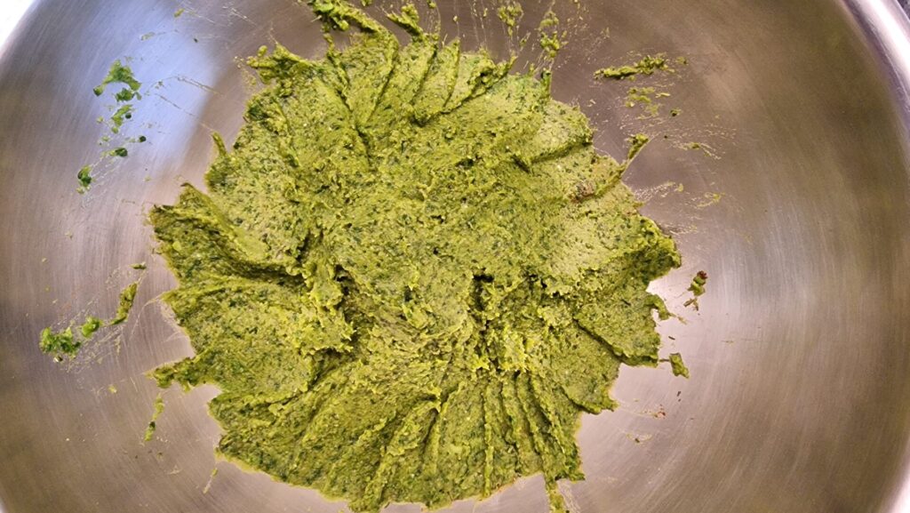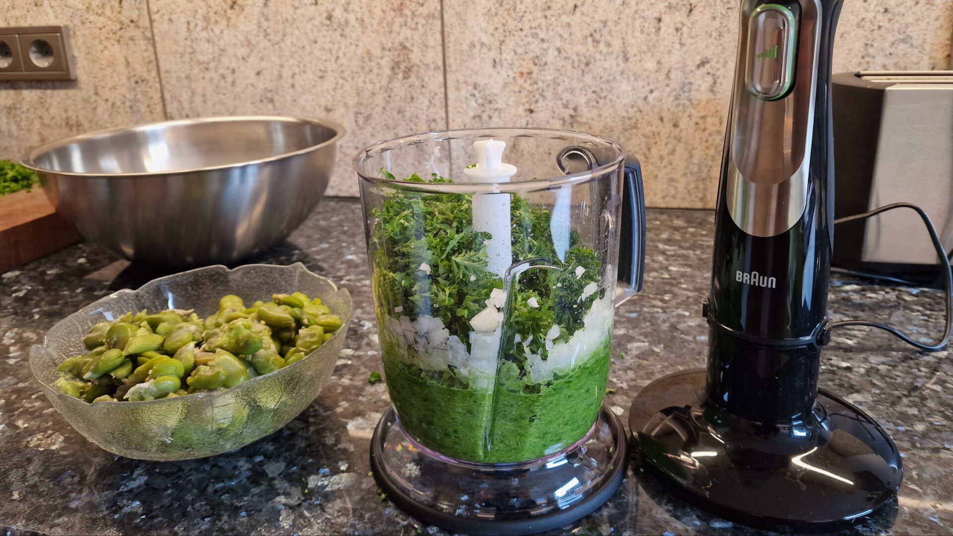 Die Favabohnen, Gemüsemischung und Backpulver im Mixer pulsierend fein zerkleinern, bis eine stückig-feste, grüne Paste entstanden ist.