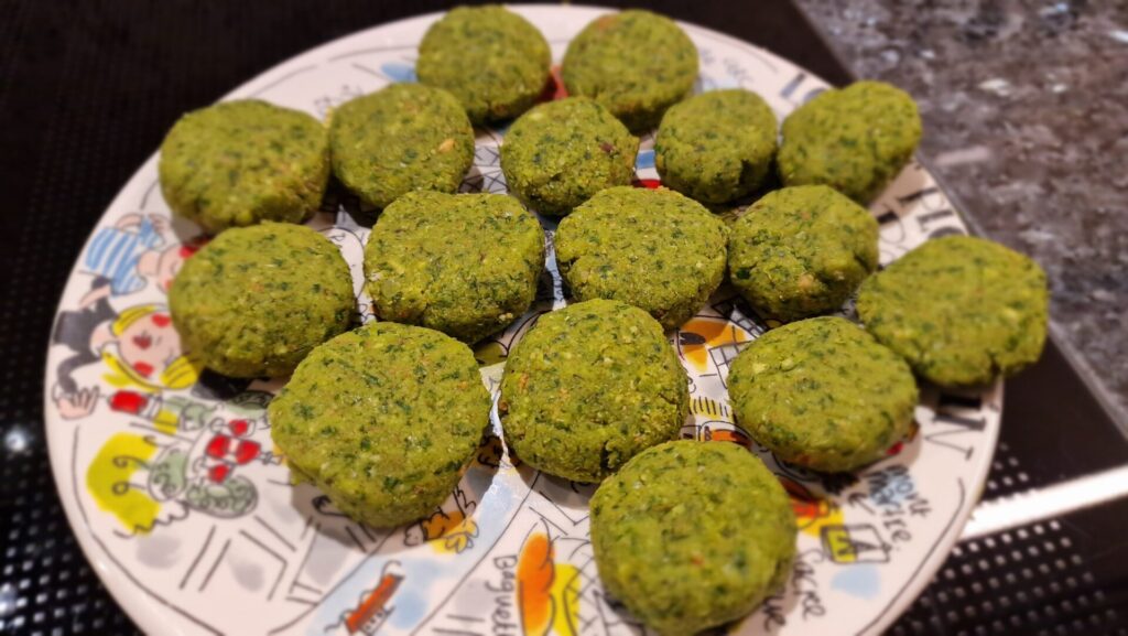 Nun für die Frikadellen immer einen Esslöffel der Teigmasse zu einer Kugel formen, diese leicht platt drücken. Der Teig darf nicht zu feucht sein sonst zerfallen später die Falafel! Anschließend hilft es die Bällchen eine halbe Stunde im Kühlschrank zu kühlen um einem späteren Zerfallen vorzubeugen.