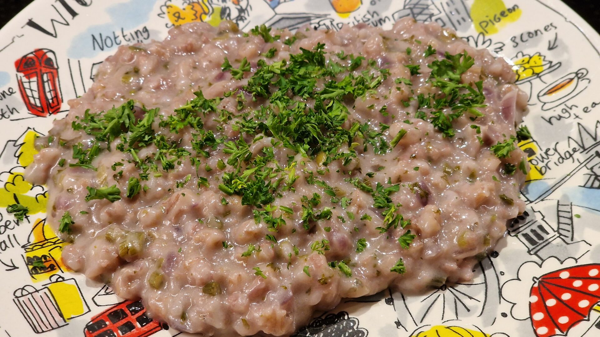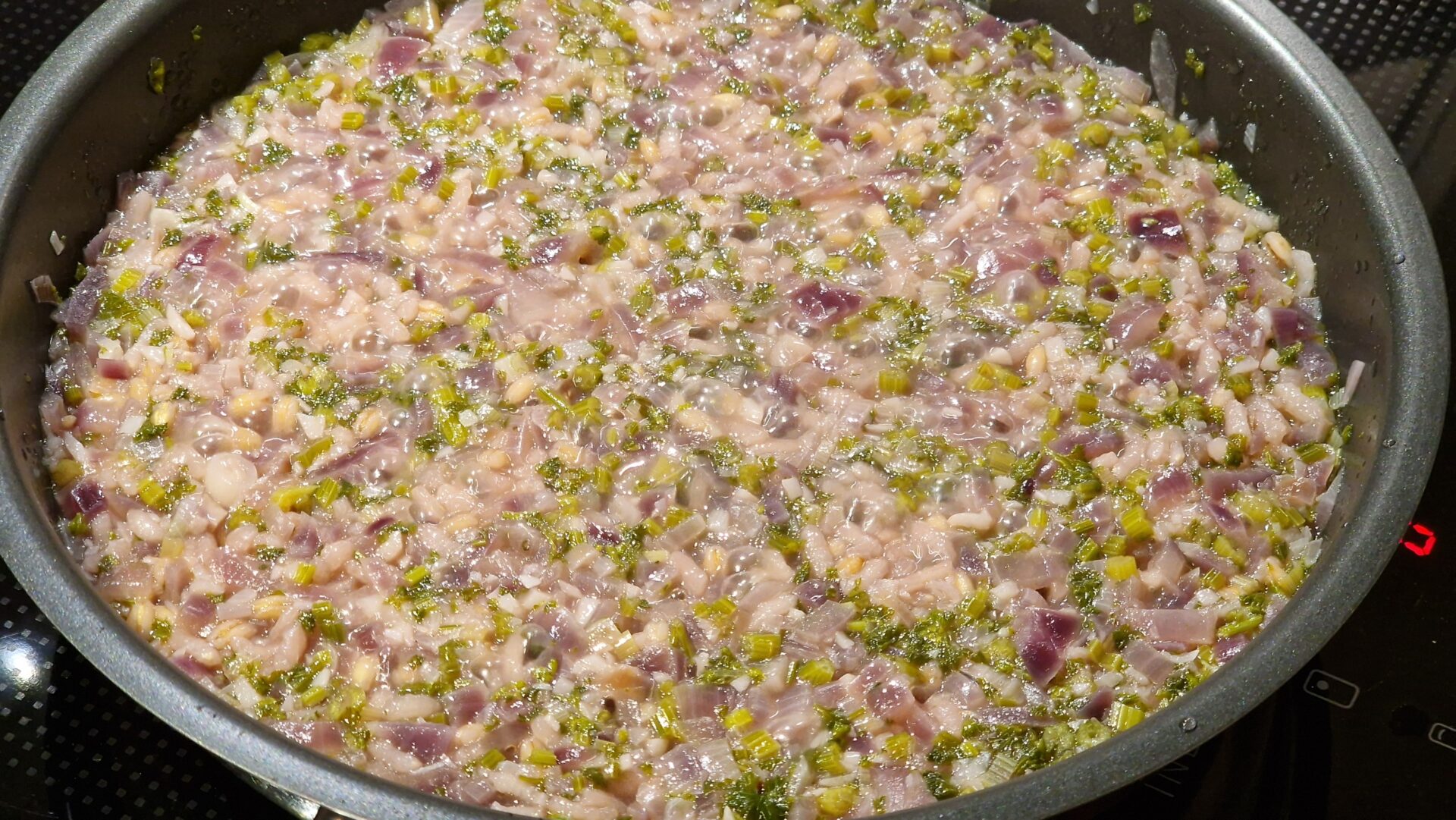 Zum Abschluss werden etwas Crème fraîche – wie bei Ridotto Milanese – und geriebener Parmesan hinzugegeben. Guten Appetit.