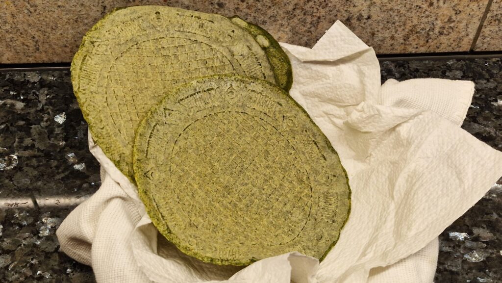 Alle Zutaten werden gemischt, bis ein leicht flüssiger Teig entsteht. Im Kühlschrank eine halbe Stunde ruhen lassen. Dann auf dem Neujahrskucheneisen abbacken und füllen.