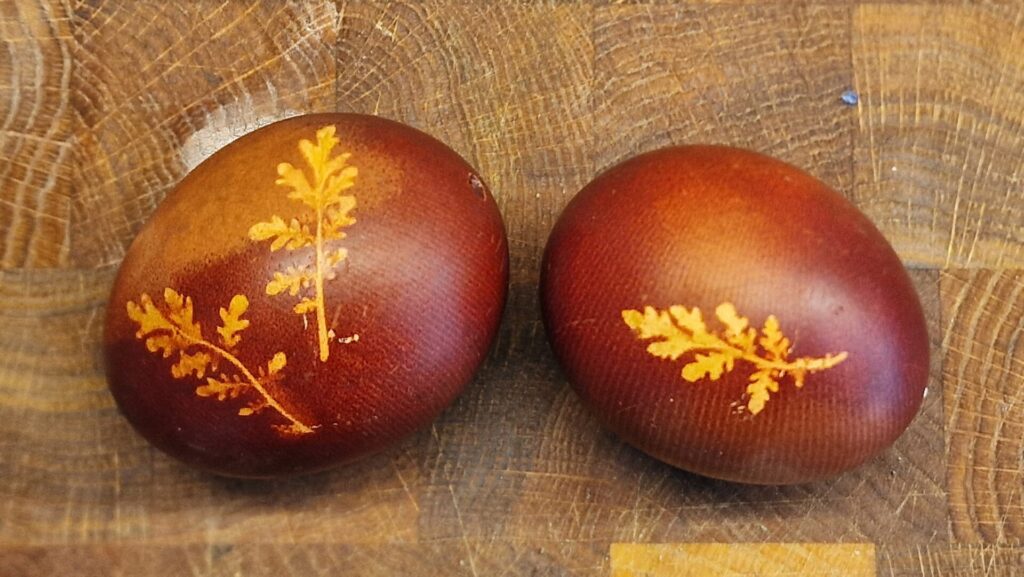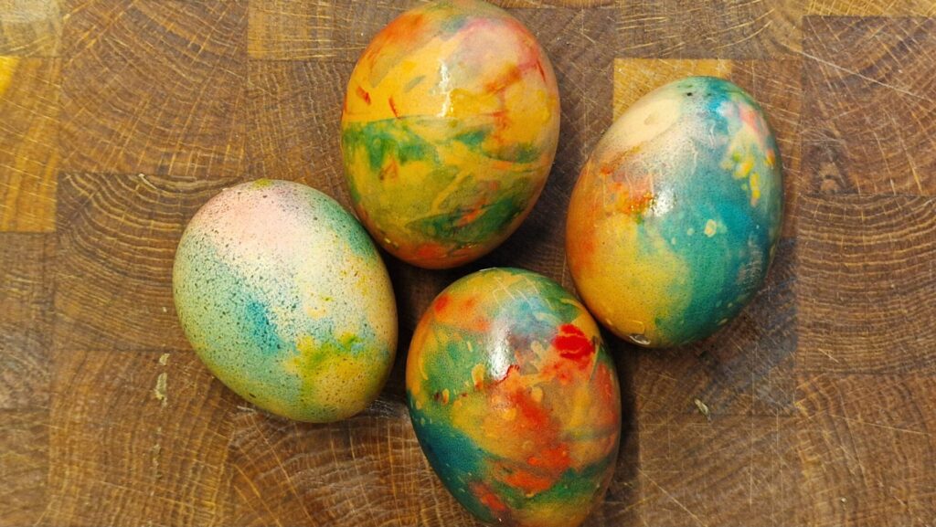 - Tipp: Vor dem Färben Gummibändchen um die Eier legen . Das gibt hübsche hellere Streifen in der Färbung