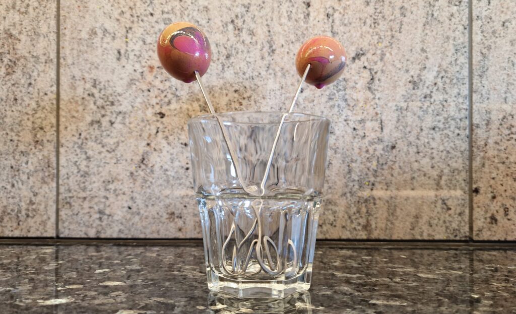 - In eine kleine Schale gefüllt kann man mit einem zuvor in Farbe getauchten und über eine Handgelenk gelegten Pinsel durch Abklopfen des Pinselstiels Farben auftropfen, die mit Stäbchen leicht spiralig zu Mustern gezogen werden.