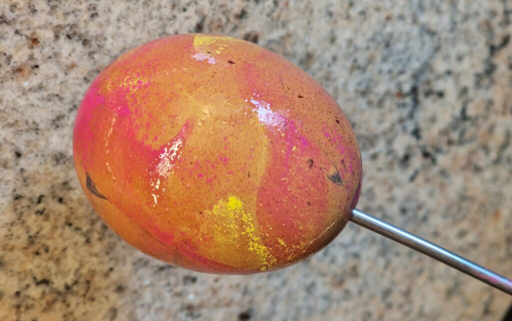 - Ei auf ein Holzstäbchen (Schaschlikspiess) setzen und in die Schale tauchen. Dann das Ei unter leichtem Drehen zügig wieder heraus ziehen, eventuell die Farbe zuvor etwas wegpusten, damit das Ei durch das farbfreie „Loch“ schlüpfen kann.
