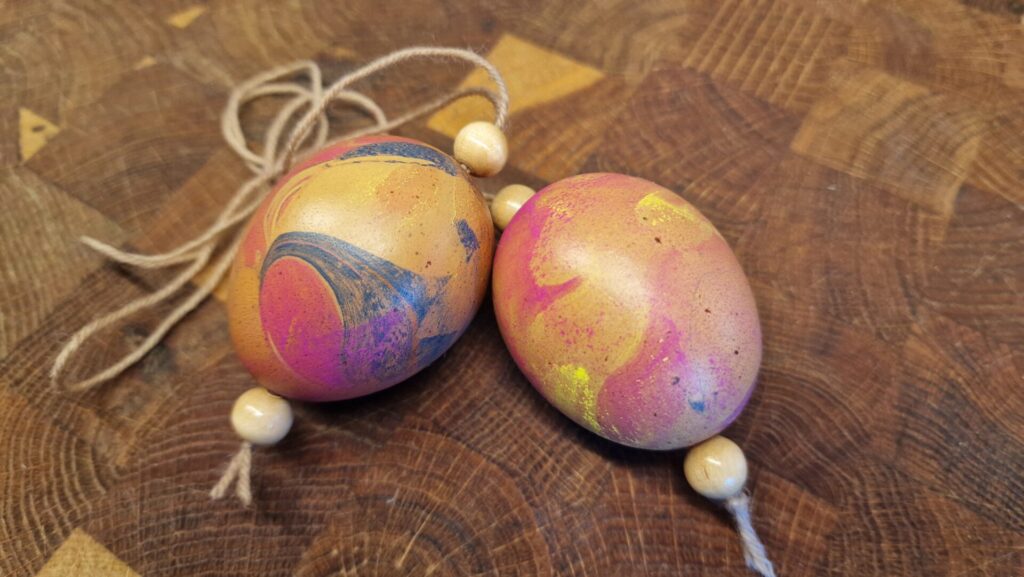 - In einem Schälchen (alte Muffinform) mit etwas Essig beträufeln und trocknen lassen, was Marmoriermuster entstehen lässt.
