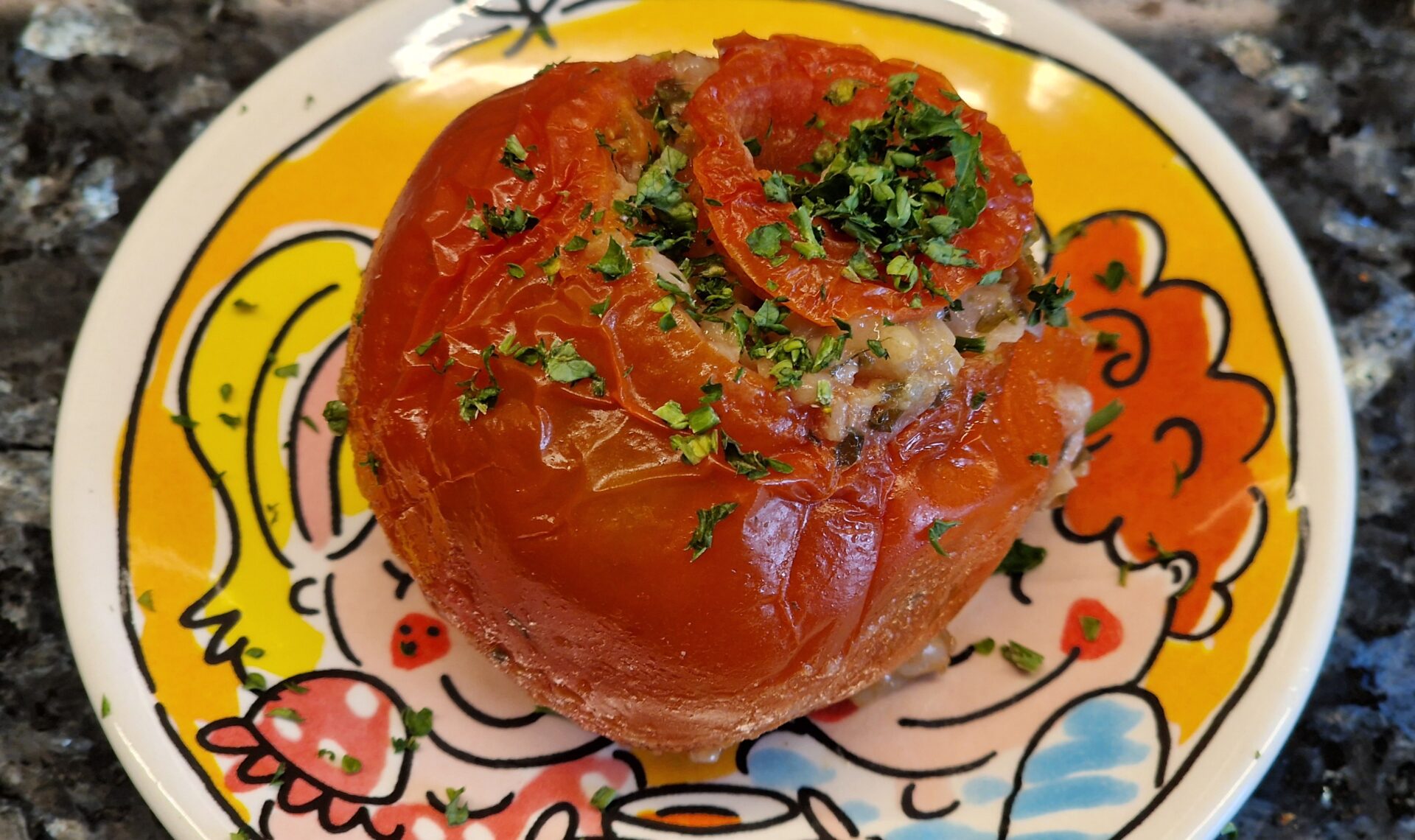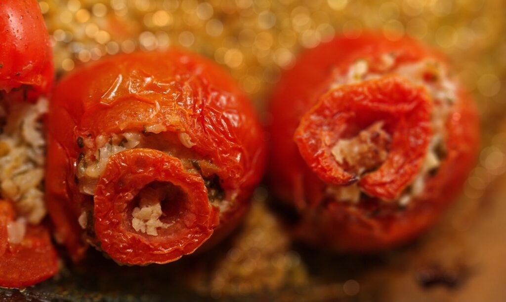 Im Backofen bei etwa 200°C (Umluft) ungefähr 25-30 Minuten garen, bis die Tomatenhaut etwas schrumpelig ausschaut. Warm oder bei Zimmertemperatur servieren.