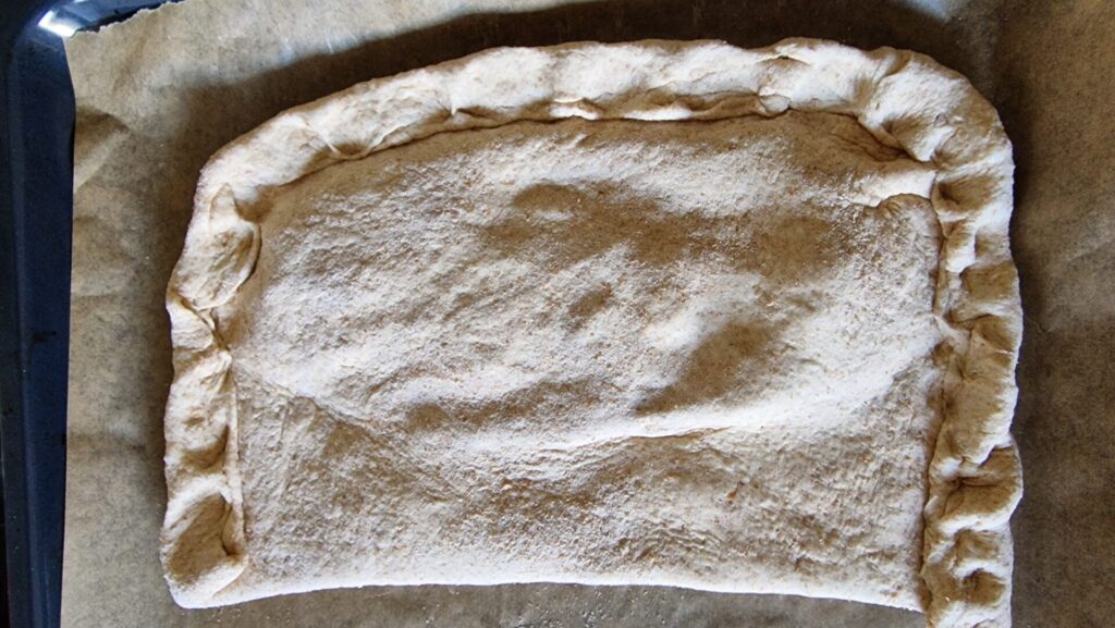 Das Rezept kann auch als eine Mischung aus normal belegter Pizza mit einem Calzone Anteil – nur halb zur Tasche einschlagen – zubereitet werden. Gern dann mit Schinken, Parmesan und Rucola in diesem Bereich auf der Tomatensauce belegen. Achtung – eine lange Teigführung über Nacht verbessert das Resultat noch.