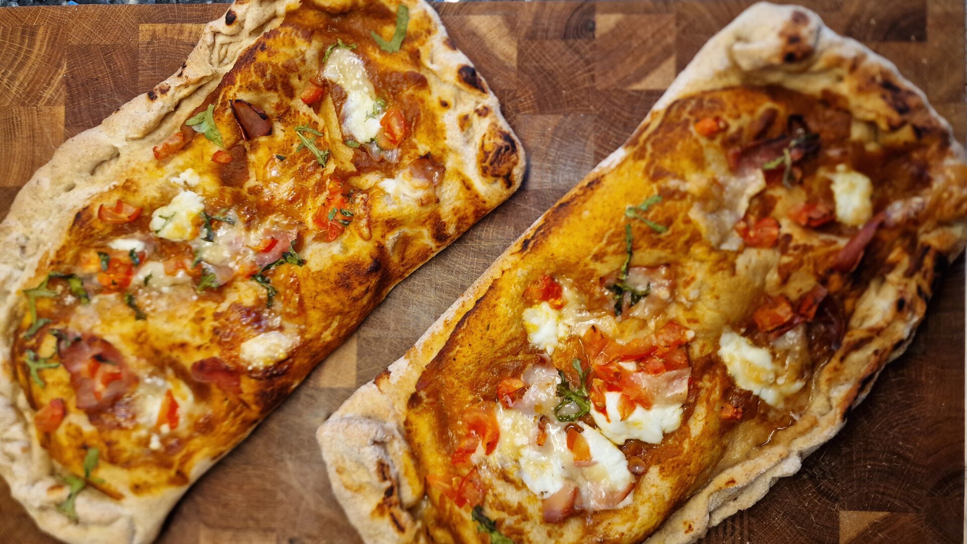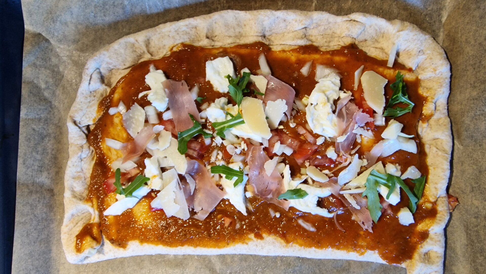 Das Rezept kann auch als eine Mischung aus normal belegter Pizza mit einem Calzone Anteil – nur halb zur Tasche einschlagen – zubereitet werden. Gern dann mit Schinken, Parmesan und Rucola in diesem Bereich auf der Tomatensauce belegen. Achtung – eine lange Teigführung über Nacht verbessert das Resultat noch.