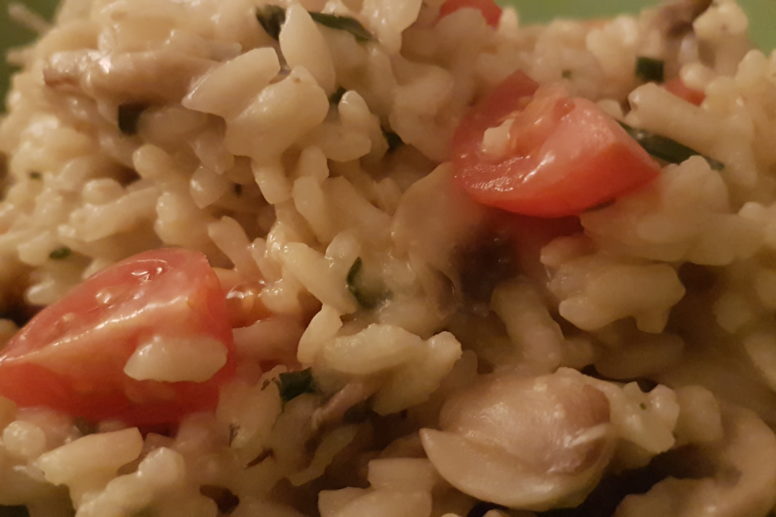 Zutaten (Mengenangaben können variieren): 350 g Risottoreis Hühnerbrühe oder Gemüsebrühe 150 g Parmesan, gerieben 1 Gemüsezwiebel 1 Knoblauchknolle 500 g Champignons 250 g Cocktailtomaten 1 Bund Schnittlauch 2 Zitronen Weißwein …