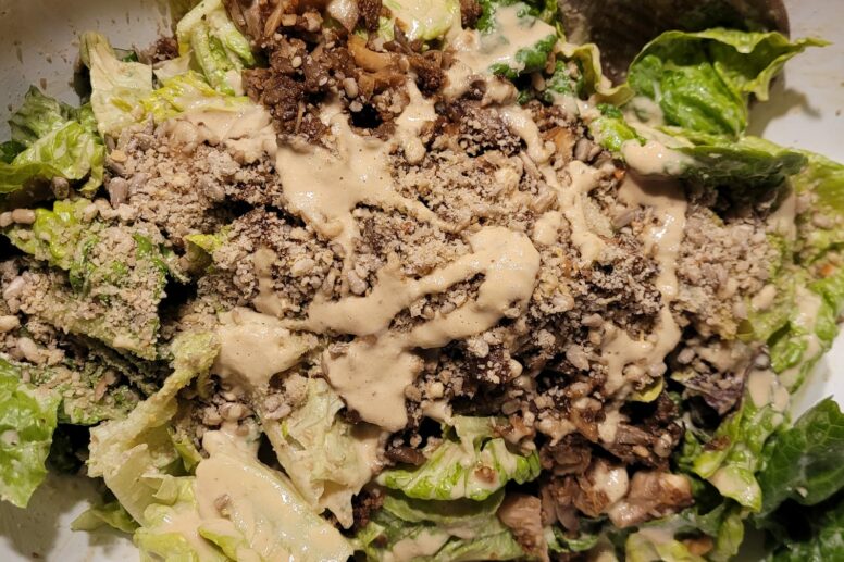 Eine Variante, die jedem Geschmack gerecht wird … Zutaten 3-4 Köpfe Romanasalat (für ca. 4-5 Personen) Für das Topping – der „Fleischersatz“: 400 g Austernpilze 1-2 EL Kartoffelstärke oder Ähnliches …