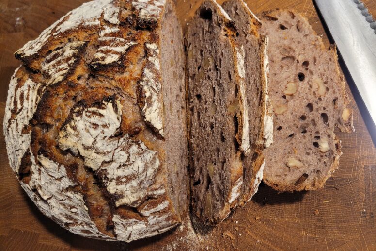 Tariks Lieblingsbrot Zutaten 450 g Weizenmehl Type 550 115 g Roggenvollkornmehl 190 g Wasser 200 g Traubensaft (rot) 12 g Salz 12 g Pflanzenöl 145 g Walnusskerne grob gehackt 17 …