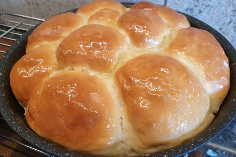 Dies leichte Hefegebäck aus Frankreich mit viel Butter ist meist durch einen geriffelten Kragen und einen glatte runde Teigkopf obenauf zu erkennen. Die Butter im Teig lässt Brioche zum Frühstuck …